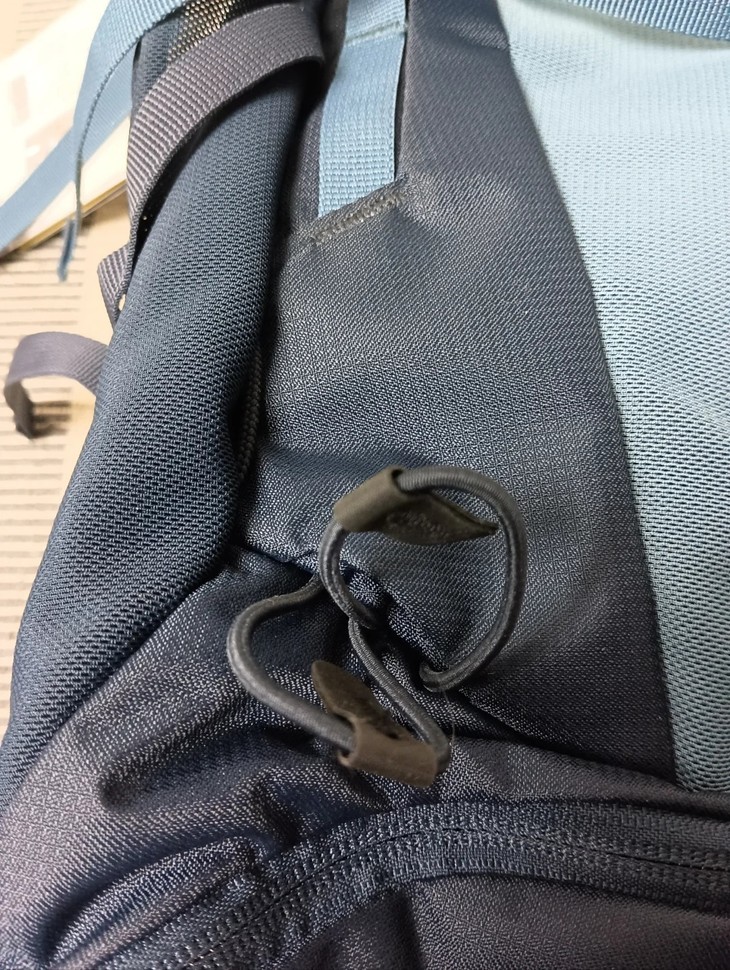 登山杖挂绳玩双标:右边用两根弹力绳固定,左边是织带+隐藏收纳设计,用不用都能收得干干净净,强迫症狂喜!顶上还有个备用挂点,扣具一按秒操作。