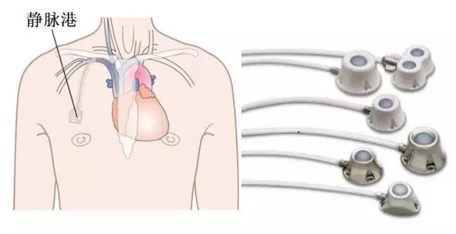 Port的导管末端也是进入中心大静脉并靠近心脏,与PICC不同的是,导管是从较大的静脉进入,如颈静脉、锁骨下静脉、股静脉等,导管的另一端连接一个药盒,整个导管及药盒完全埋入皮下(通常是胸壁皮肤下),体表不露任何导管。