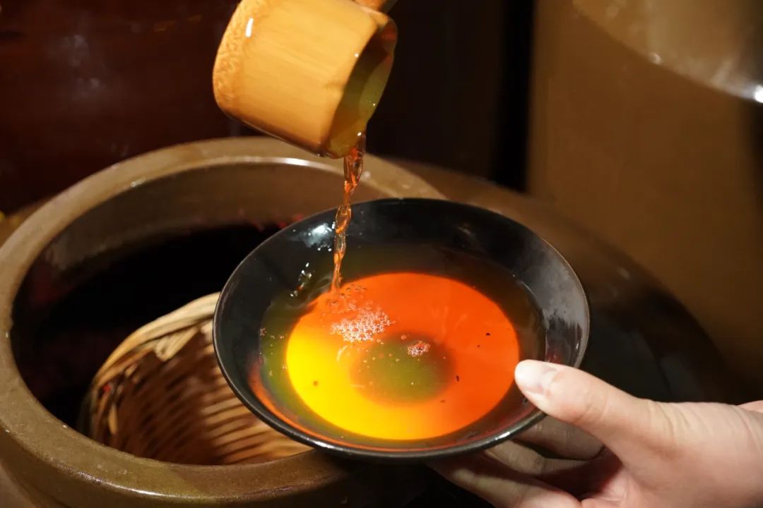 2024年立冬后第一甑糯米上汽蒸熟,饱含淀粉的糯米,化成了酸甜辛香,米粒渐成中空,随同汩汩发酵的气泡,泛浮在醪液表面,竹制酒篘将糯米和醪液分离出新酒;