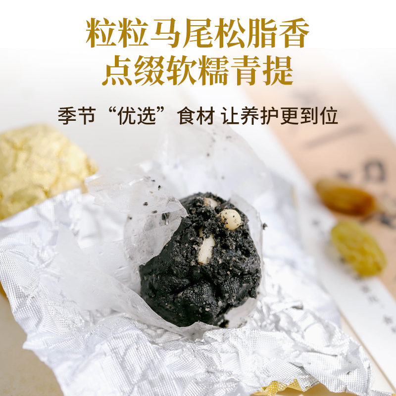 这款黑松露松仁葡萄干芝麻丸是应对五之气研发,这个阶段容易秋燥,服用不容易上火,能给头皮带来更精确的养料