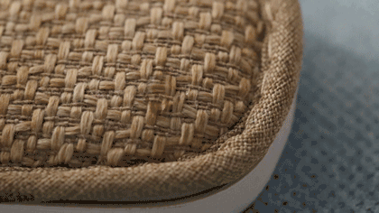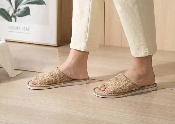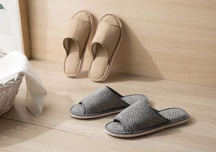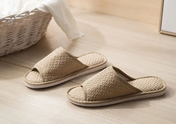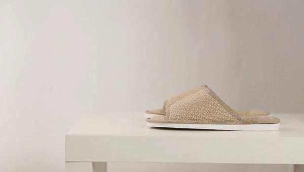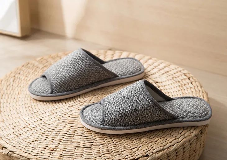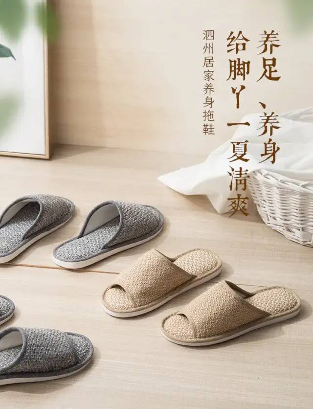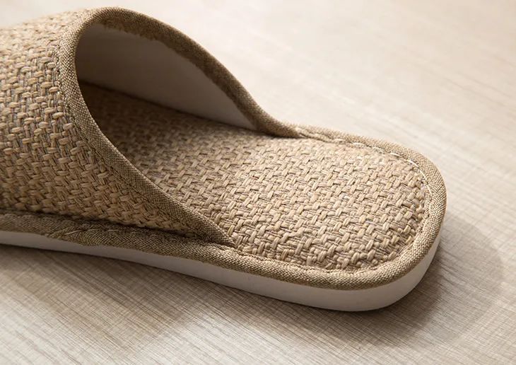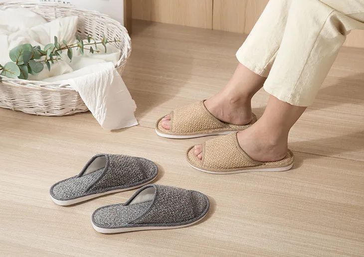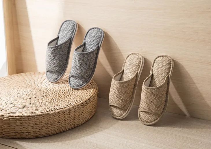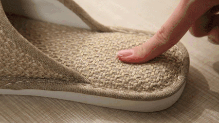 这款拖鞋却很特别——用的是涤麻,并且仿草藤凉席织法。摸上去,有细微凹凸感。