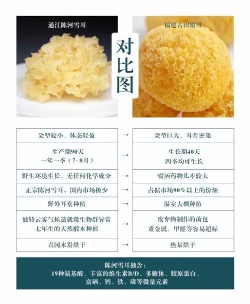 通江陈河雪耳因其富含19种人体必需而又不可合成的氨基酸、维生素B、蛋白质(胶原蛋白)、多糖体、多种微量元素(富硒)、多种矿物质等,其营养价值远非福建古田菌包银耳所能比的。