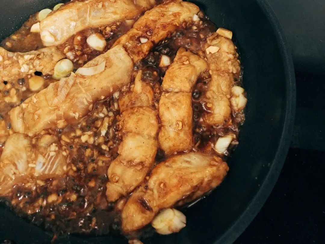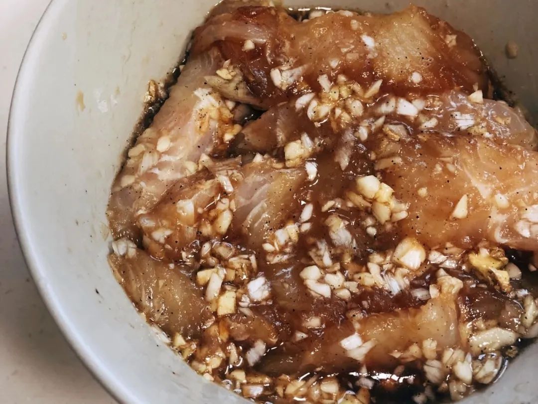 2 | 蒜末、姜末、葱末、生抽、料酒、盐、淀粉、橄榄油各一勺,并加入少许黑胡椒,腌制鱼肉15-30分钟。