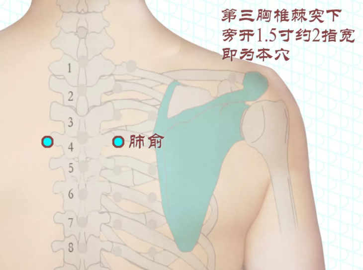 2.肺俞穴:位于第三胸椎棘突下旁开1.5寸处,具有宣肺止咳、理气平喘的作用,适用于呼吸系统疾病。