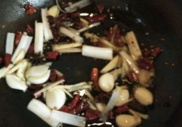 1、锅中放入底油,放蒜末、1个大料、适量干辣椒,爆香;