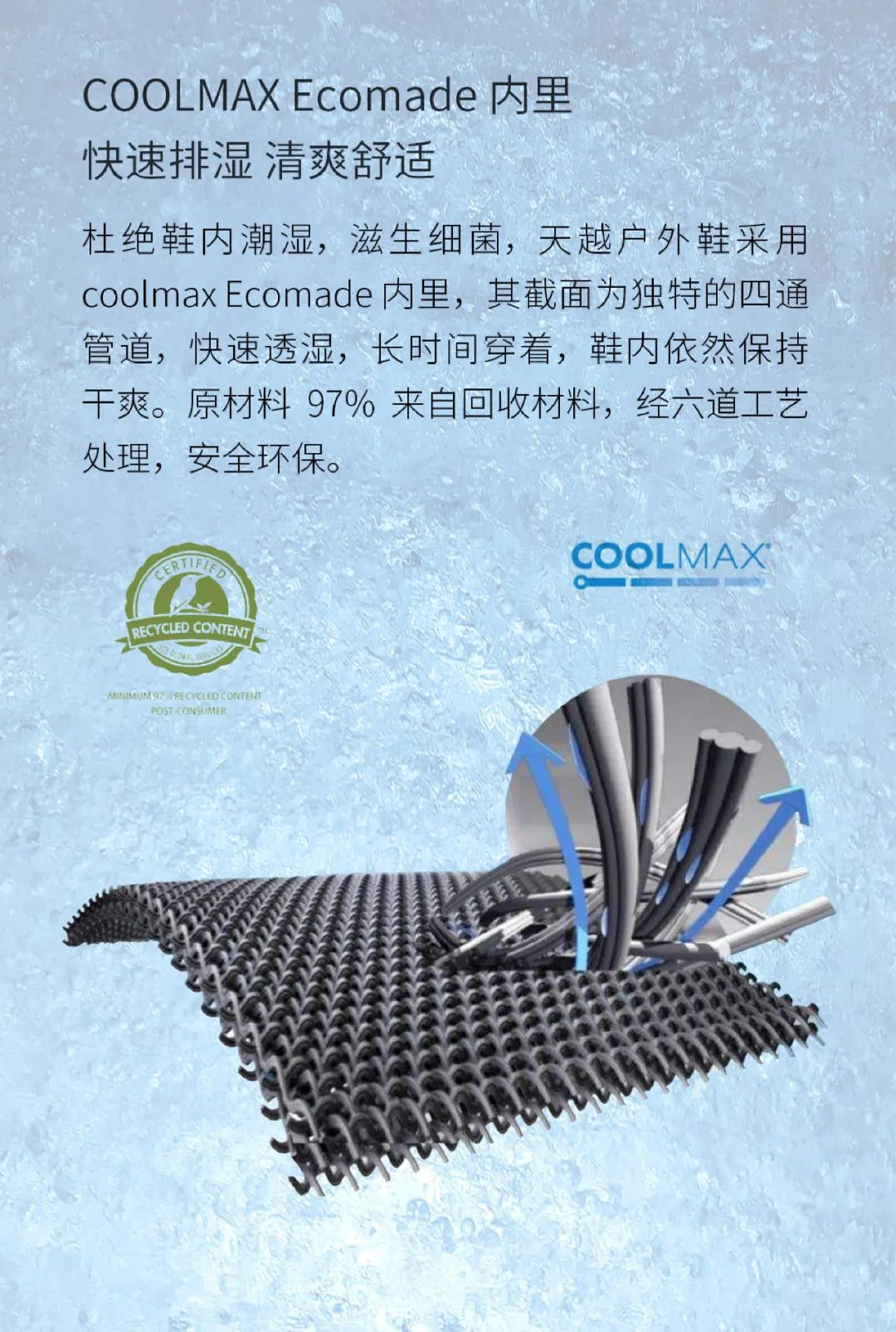 杜绝鞋内汗湿,滋生细菌,新款特意采用Coolmax Ecomade 速干内里,横截面为独特四维管道,快速排湿,清爽舒适!