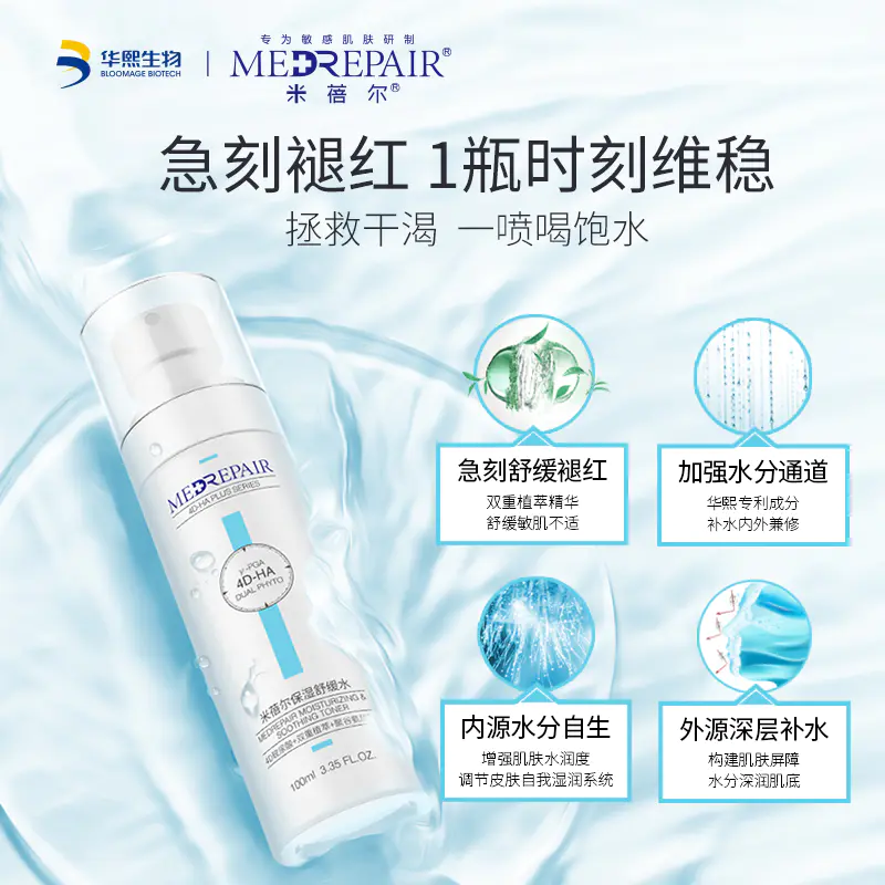 华熙生物集团旗下——米蓓尔MEDREPAIR,源自华熙生物多年潜心研发,“精于修复,专注美丽”为消费者解开敏肌密码,4D-HA四重活水创专利配方取代市场主成分,提供解决敏肌问题的方案。