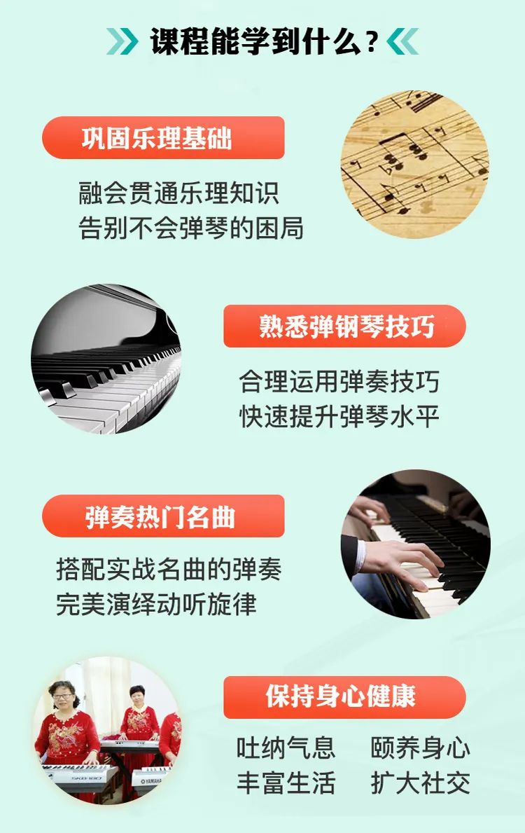 不限年龄!无学历要求!只要您想了解弹钢琴的知识就能加入(社群内会更新关于钢琴相关的专业知识,也有免费的系列线上直播课,群内还伴有助教老师,主打陪伴式督促学习!)