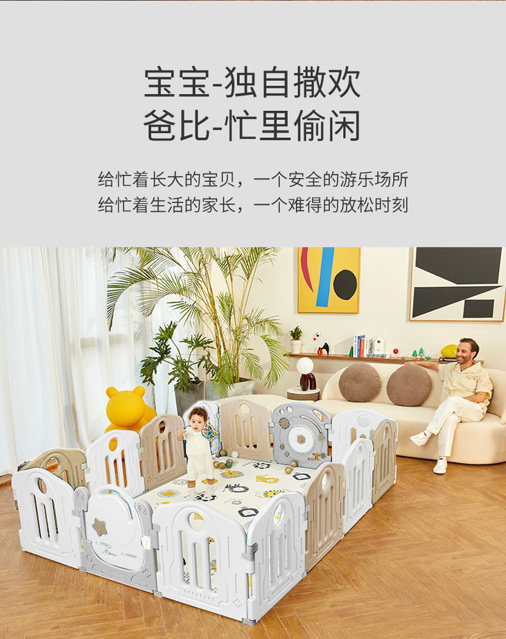 游戏围栏也叫儿童围栏、儿童游戏围栏,主要作用是将宝宝放在围栏里面,让宝宝在安全的活动范围内玩耍,它不但能防止宝宝磕碰,还能促进宝宝学习走路,更有利于家长和宝宝之间的游戏和互动。