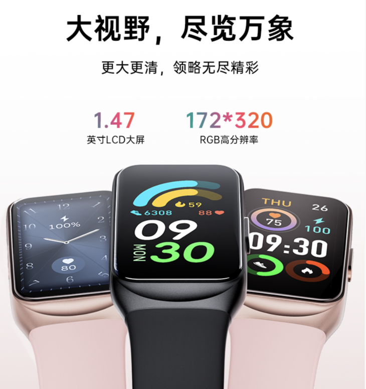 1.47英寸长屏,完美贴合手腕,高分辨率更清晰。