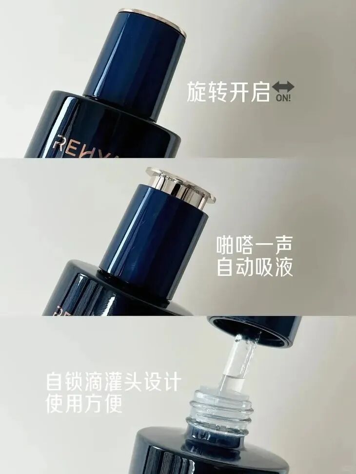 旋转拧开的同时,泵头会自动弹出,并自动吸取精华液,简单取料让护肤变得更简单。