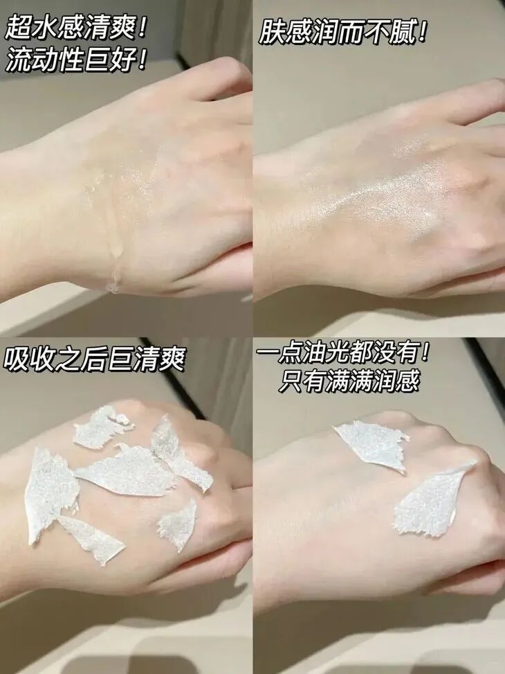 因为用了选择性促渗技术,质地就像牛奶般顺滑细腻,轻轻一抹开就化水,一点都不黏腻。