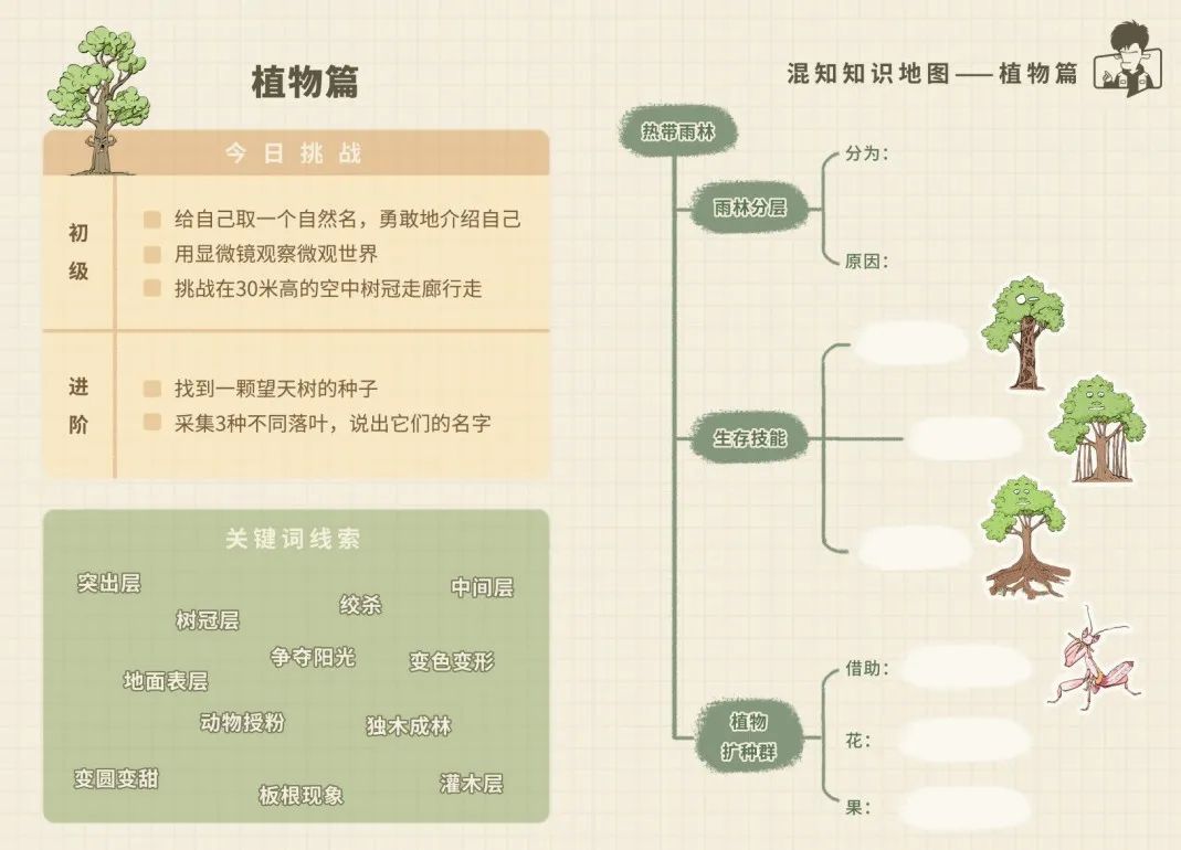植物园的研学老师将带领孩子们,寻找神奇雨林的代表植物,学习从根、茎、叶、花、果实、种子六个部分观察与认识这些热带王国的奇花异草,归纳它们生存与繁衍的智慧。