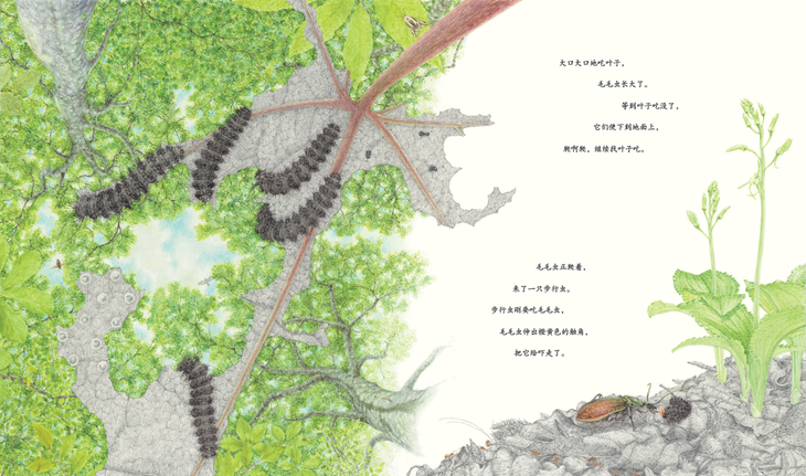 馆野鸿的文本,简洁诗意,平实内敛,不用拟人手法,不夸张煽动情绪。在《虎凤蝶》这本书中,有整整四个大跨页的图画,文字都只有一句“蛹还是那个样子。”