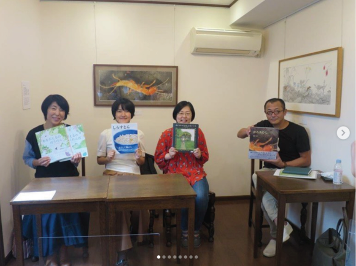 馆野鸿有三个弟子,其中左边这位叫作川岛春子,她手上拿的两本书是馆野鸿创作文本,她来作画的。这两本书文本的故事性很强,里面充满了儿童的语气和对话。所以馆野鸿并非不能写故事性的文本,而是他自己做了选择。