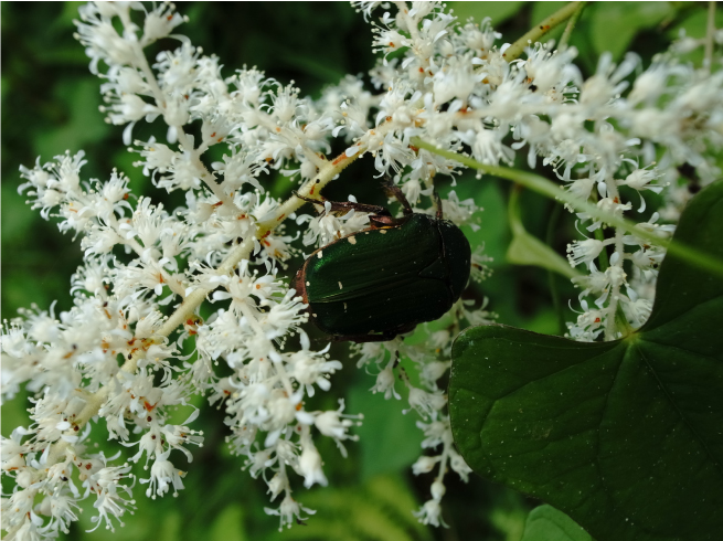 仔细看了下,竟然有金龟子停在上面