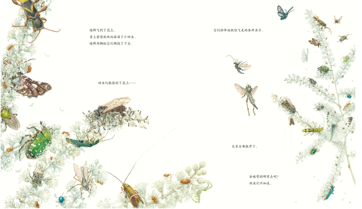 “馆野鸿老师用惯用的手法,抓到了停在花上的虫子。然后仔细观察这些抓回来的虫子,参考着进行作画。”上面就是这种白色的花朵在书中的呈现。《斑蝥》中有很多让人印象深刻的画,比如非常有冲击力的下面这张: