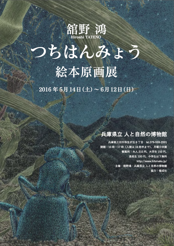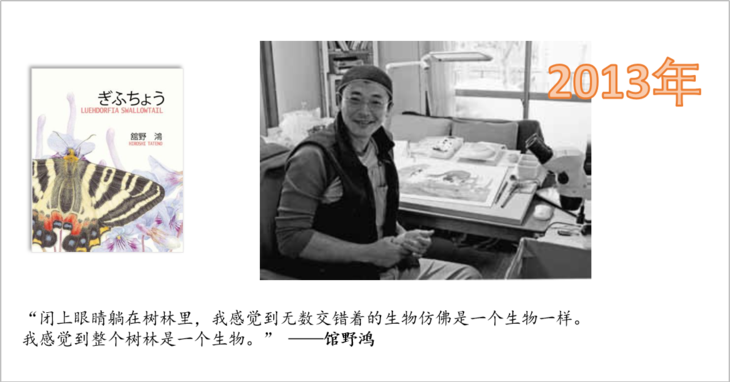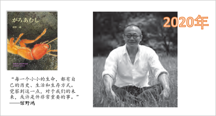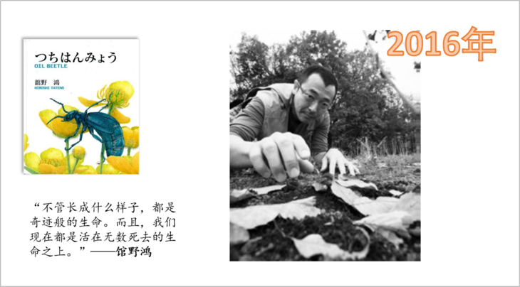现在馆野鸿的官方简介是这样的:1968年出生于日本横滨市。曾师从已故的熊田千佳慕。做过戏剧、现代美术、音乐等方面的工作,后作为评估环境影响的生物调查员,全方面接触到日本国内的野生生物。在进行生物调查的同时,也亲手绘制景观图、生物图鉴画、生物解剖图等。2005 年,经摄影师久保秀一建议,开始创作绘本。作品《斑蝥》获小学馆儿童出版文化奖。其他主要作品有《埋葬虫》《虎凤蝶》(偕成社),《茧蜂》(泽口多摩美/ 著)、《在叶子上》(福音馆书店),《爱捉迷藏的雨蛙》(川岛晴子/ 绘,世界文化社),《宫泽贤治的鸟》(国松俊英/文,岩崎书店)等。生物画作品有《生物的生活》(学研社)、《世界上的美丽鸟羽》(诚文堂新光社) 等。