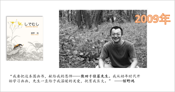 馆野鸿幼年时就师从日本的法布尔——熊田千佳慕。他的第一本书《埋葬虫》,是继承先师遗志的作品。他也在后记中写道,“我要把这本图画书,献给我的恩师——熊田千佳慕先生。我从幼年时代开始学习画画,先生一直给予我温暖的关爱,抚育我长大。”因为小时候经常去老师家学习玩耍,所以他们关系亲密。