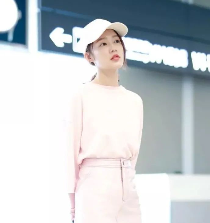 再看看李沁这一身甜美粉色长袖T恤+粉色漆皮裙,简单又随性。