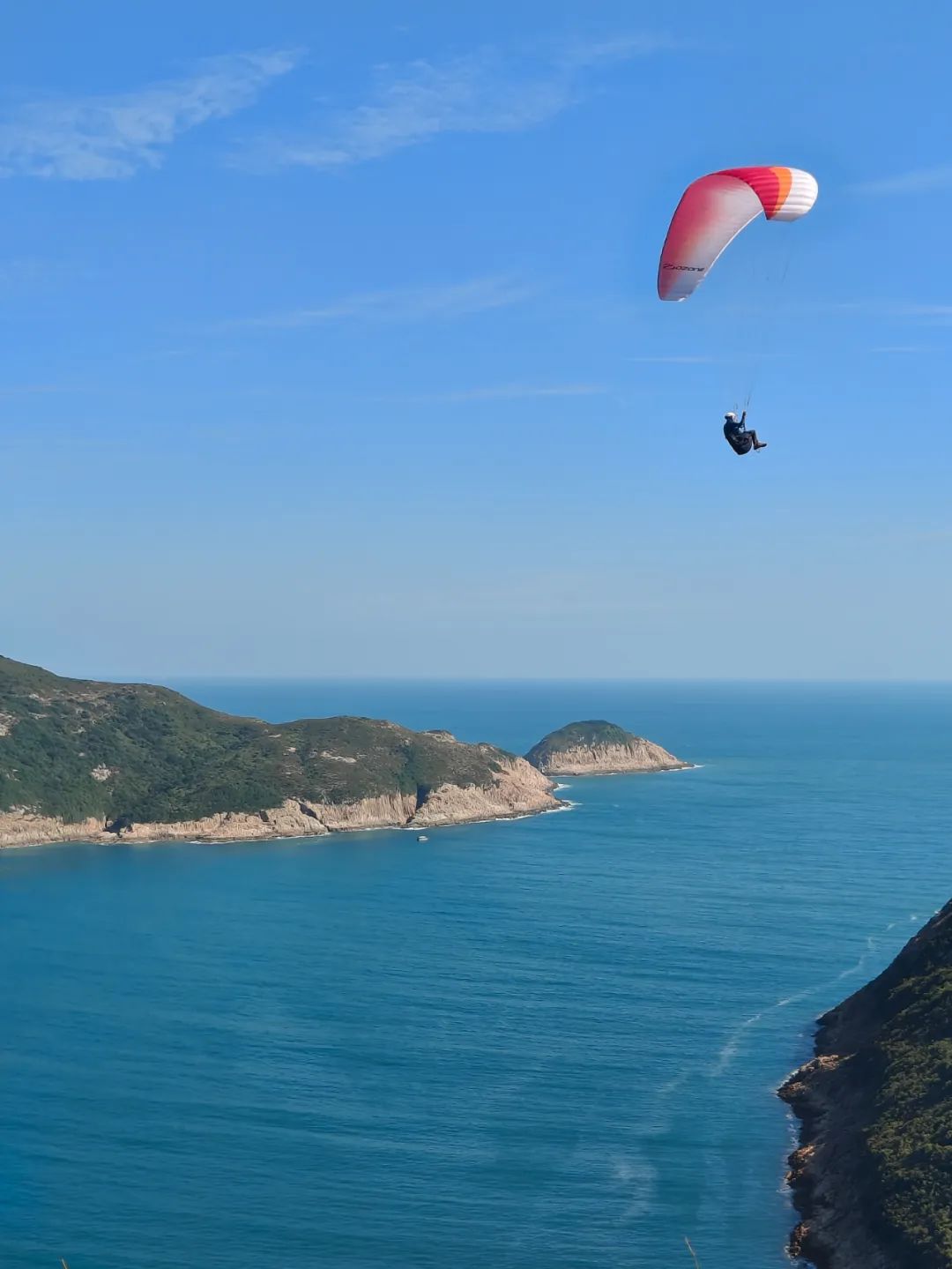 本以为山海相连的麦径二段已经很惊艳了,直到后来,某一天来到麦理浩径四段的昂坪高原。昂坪高原有一个非常开阔的观景台,可以俯瞰整个西贡市全貌。如果天气好,肯定会看到滑翔伞爱好者在此飞翔。