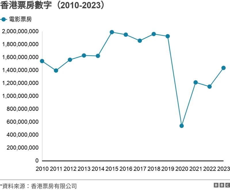 2023年,香港全年票房收入约 14 亿,与疫情前 2019 年的 19 亿相比下跌 25.5 %,基本上倒退至 2011 年的水平。