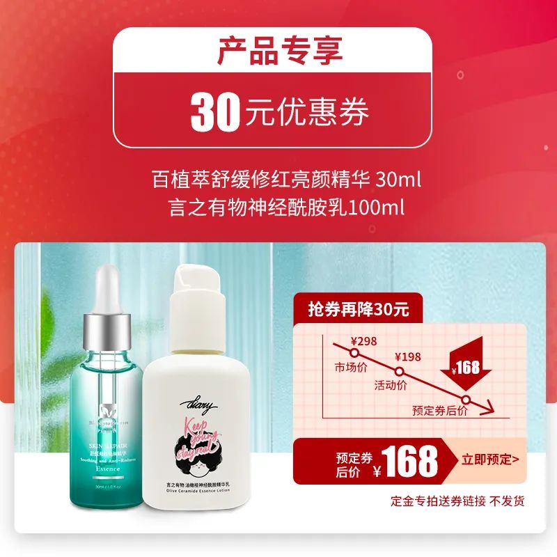 4、【亮颜嫩白】百植萃舒缓修红亮颜精华 30ml+言之有物油橄榄神经酰胺精华乳100ml 198元