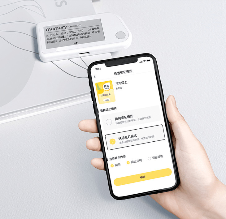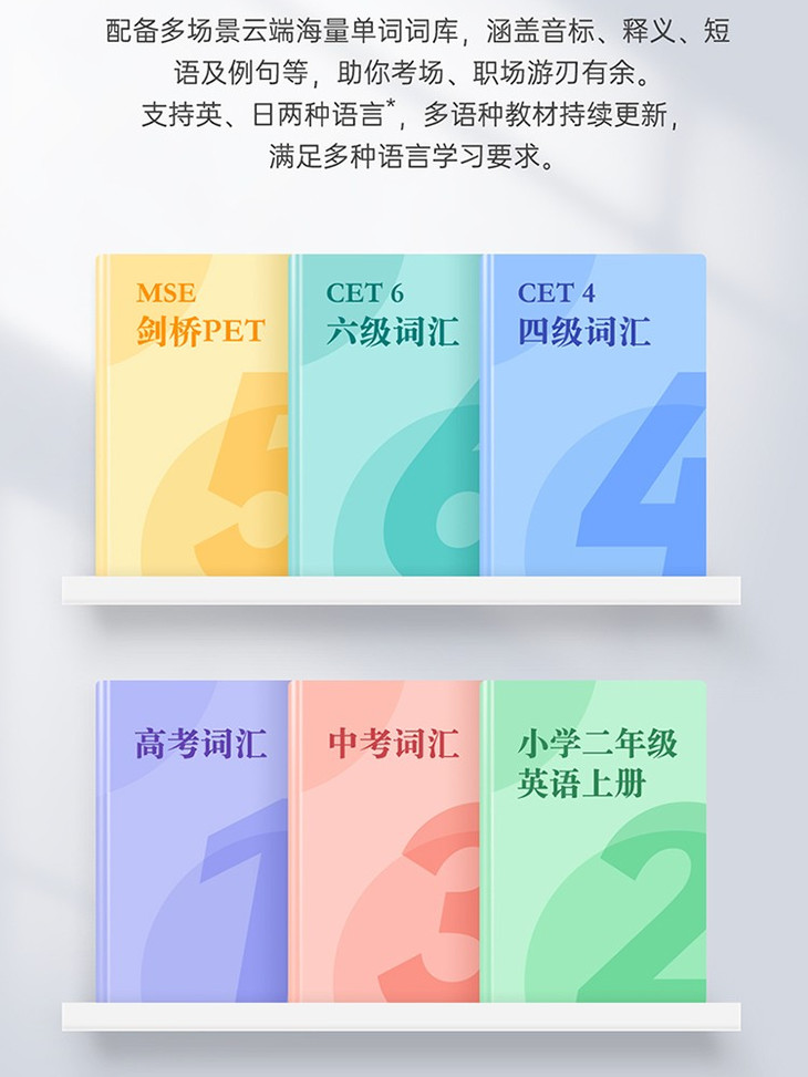 电子单词卡小小的身材,却可以容纳海量词库资源,完美地解决了日常记单词受困于环境和书本的限制。