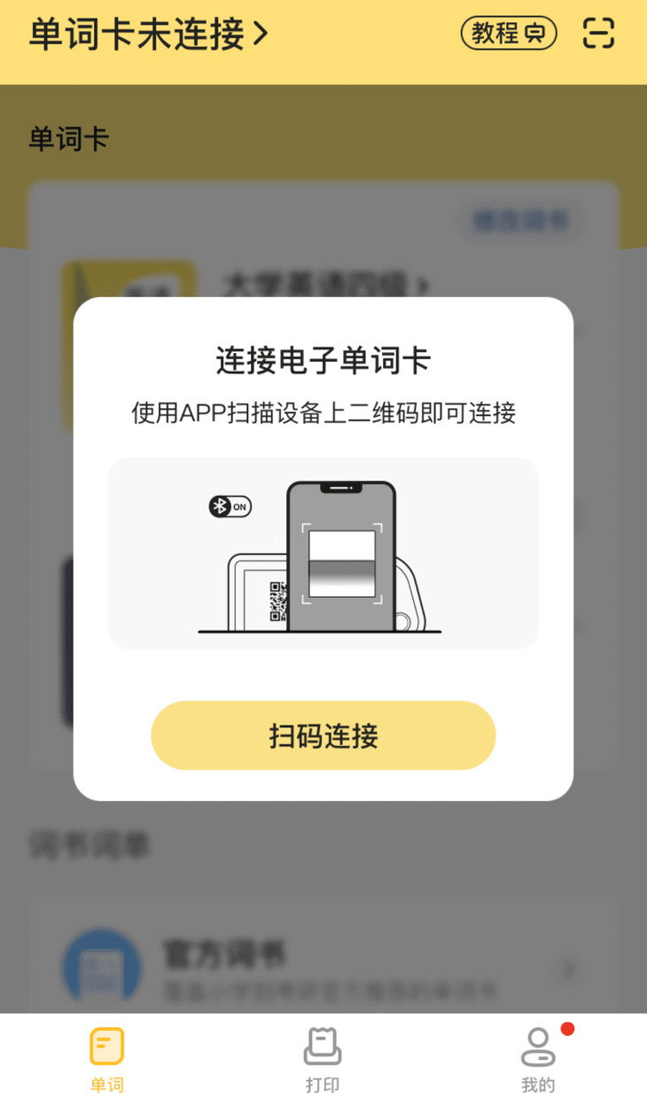 电子单词卡需要通过喵喵机app绑定后自由使用,连接也是非常简单的,只需要扫描设备上的二维码即可一键连接。在app当中可以设置官方词书任务、个人自建词书任务、和单词卡数据双向同步。