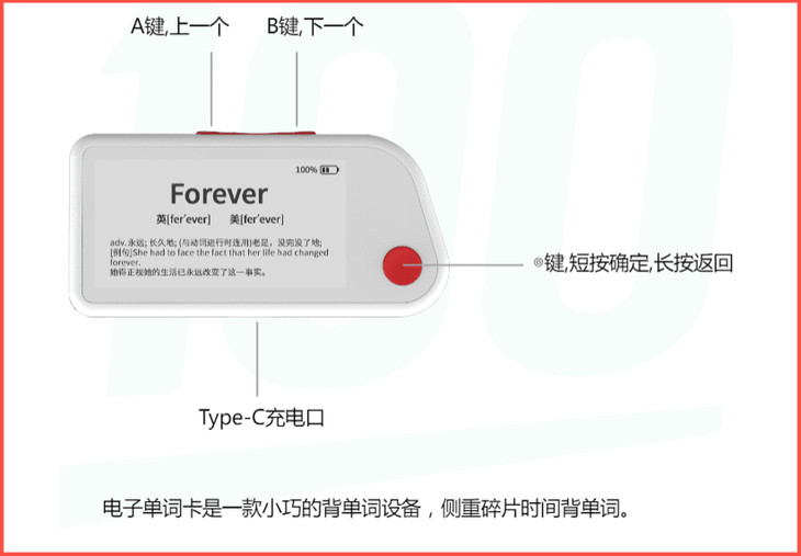 而且电子墨水屏是非常省电的,这款电子单词卡完全不用关机,全天候显示都可以续航100天,功耗足够低,也能使用地更加长久。