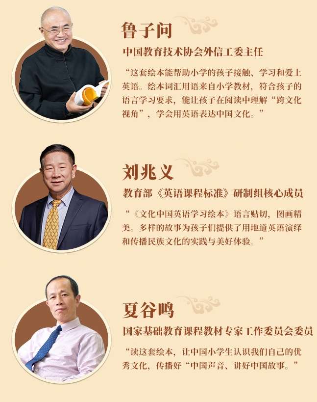 如何引导孩子学习优秀传统文化?《文化中国英语学习绘本》智能书内容丰富,形式多样,能潜移默化地提升孩子的传统文化知识储备。从琳琅满目的书籍中,为孩子挑选一本优质绘本,一直是不少家长的难题。相比于其他图书,这套绘本为何称得上“优质”?首先,《文化中国英语学习绘本》是一套落实国家教育方针、贯彻“立德树人”“五育并举”要求的英语学习读物,由教育部《英语课程标准》专家鲁子问、夏谷鸣教授担任主编,教育部《英语课程标准》研制组专家刘兆义老师主审。教育专家亲自为内容把关,确保绘本适合中小学生阅读学习,家长朋友也不用在纷繁复杂的绘本中再费力挑选比较。