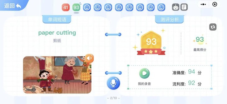 在中高考中,传统文化专有词汇时有考查,孩子在读完绘本后记不住这些词汇怎么办?借助《文化中国英语学习绘本》智能书,孩子可以在“跟读词汇”板块朗读、记忆这些专有词汇。系统基于智能语音分析技术,对孩子的发音从准确度、流利度进行评测,及时纠音正音,让孩子读得准,记得住。