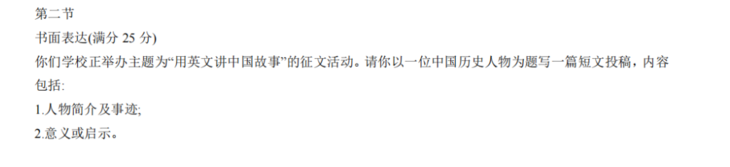 2023年高考英语全国甲卷书面表达题要求考生以中国历史人物为题写短文;全国乙卷语法填空题语篇讲述首都北京悠久的城市历史;新高考Ⅰ卷语法填空讲述中华美食小笼包;天津卷书面表达涉及中英文化交流……