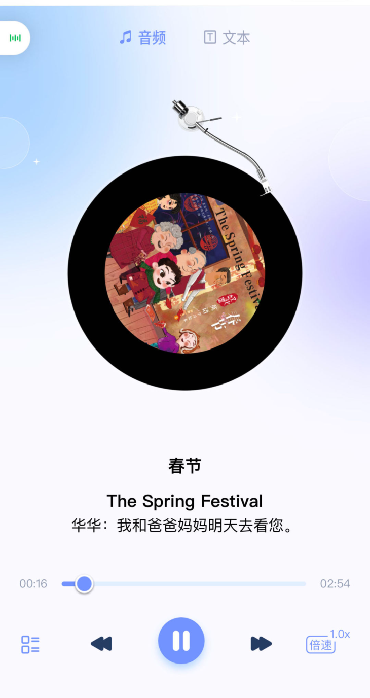 语言学习遵循听说读写,听力先行。如何增加孩子的语言输入和积累?伴听绘本主打一个“听”字,家长朋友可以为孩子播放绘本故事,让孩子听故事“磨耳朵”,逐步提升语言能力。该部分语速可自动调节,孩子跟读词汇、句子无压力,随时切换中文字幕,学习效率更高。