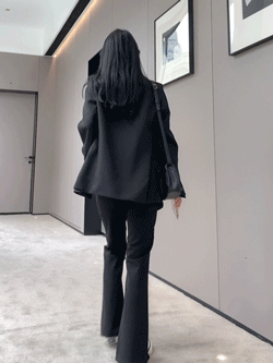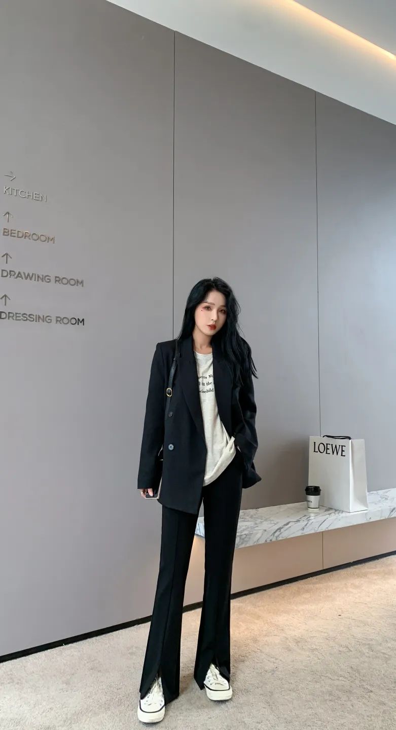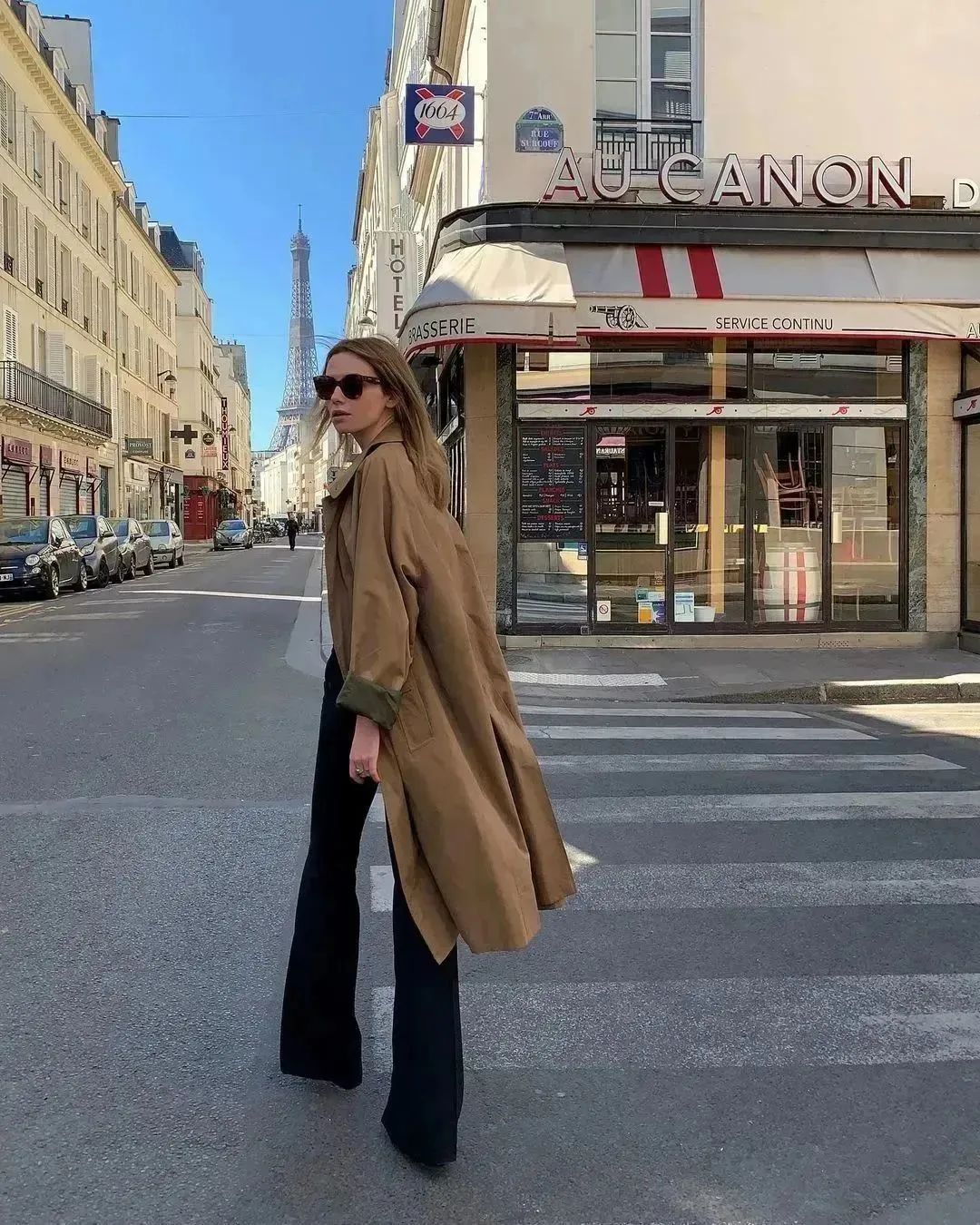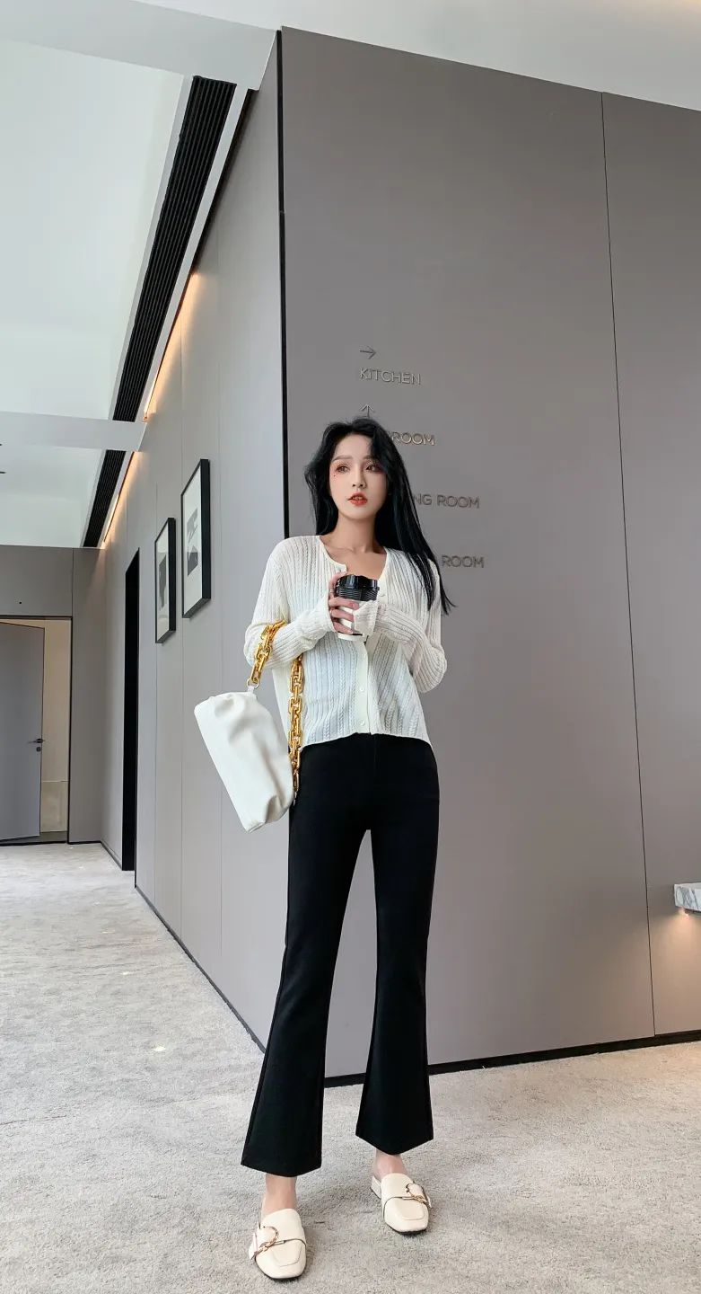 喇叭裤很适合跟中长款外套搭配,比如搭配oversize黑西装,帅气性格;搭配大衣,韩系女主范;搭配小香风外套,职场style。