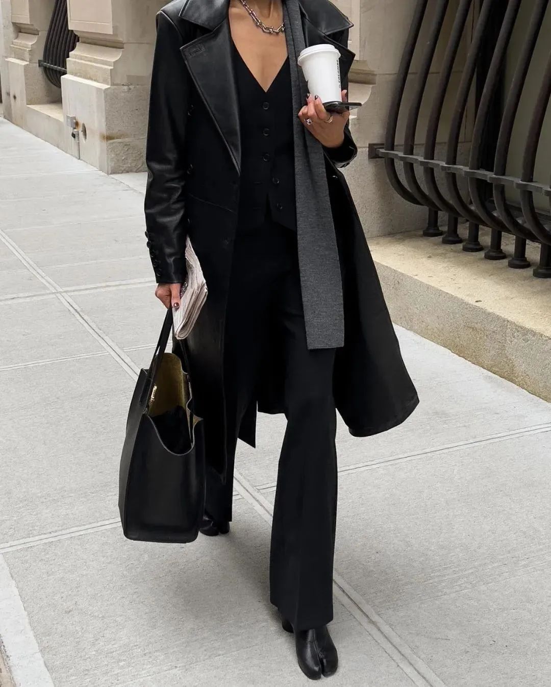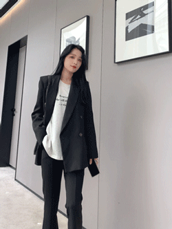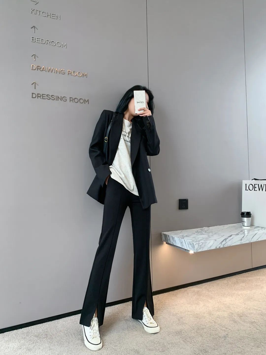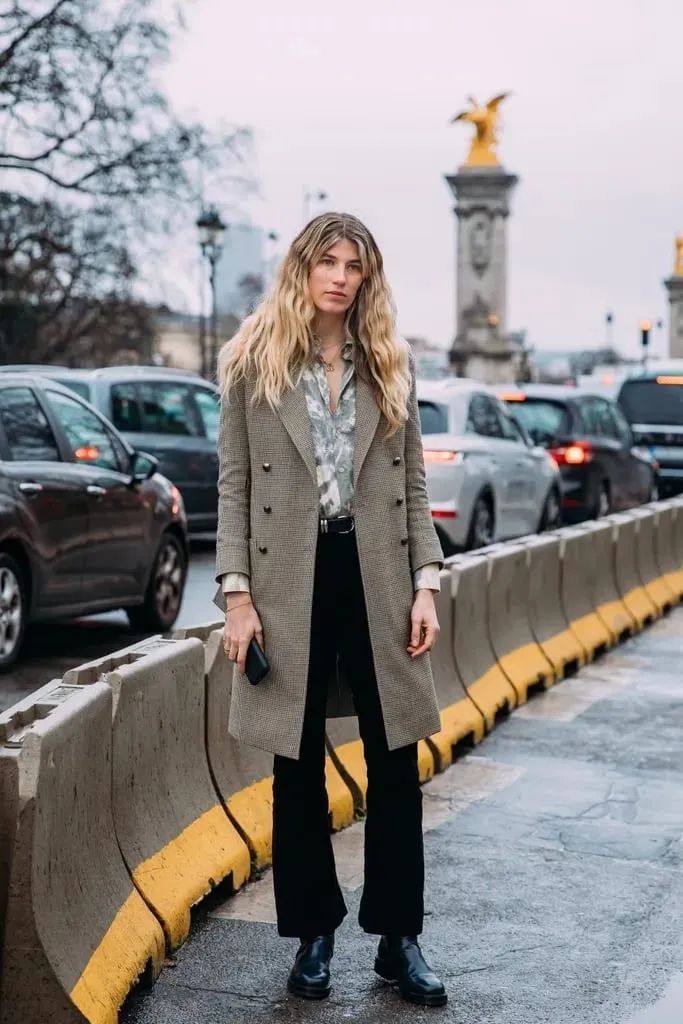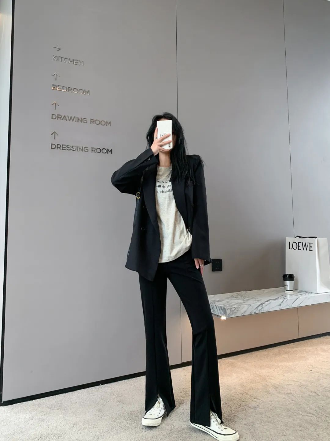 喇叭裤很适合跟中长款外套搭配,比如搭配oversize黑西装,帅气性格;搭配大衣,韩系女主范;搭配小香风外套,职场style。