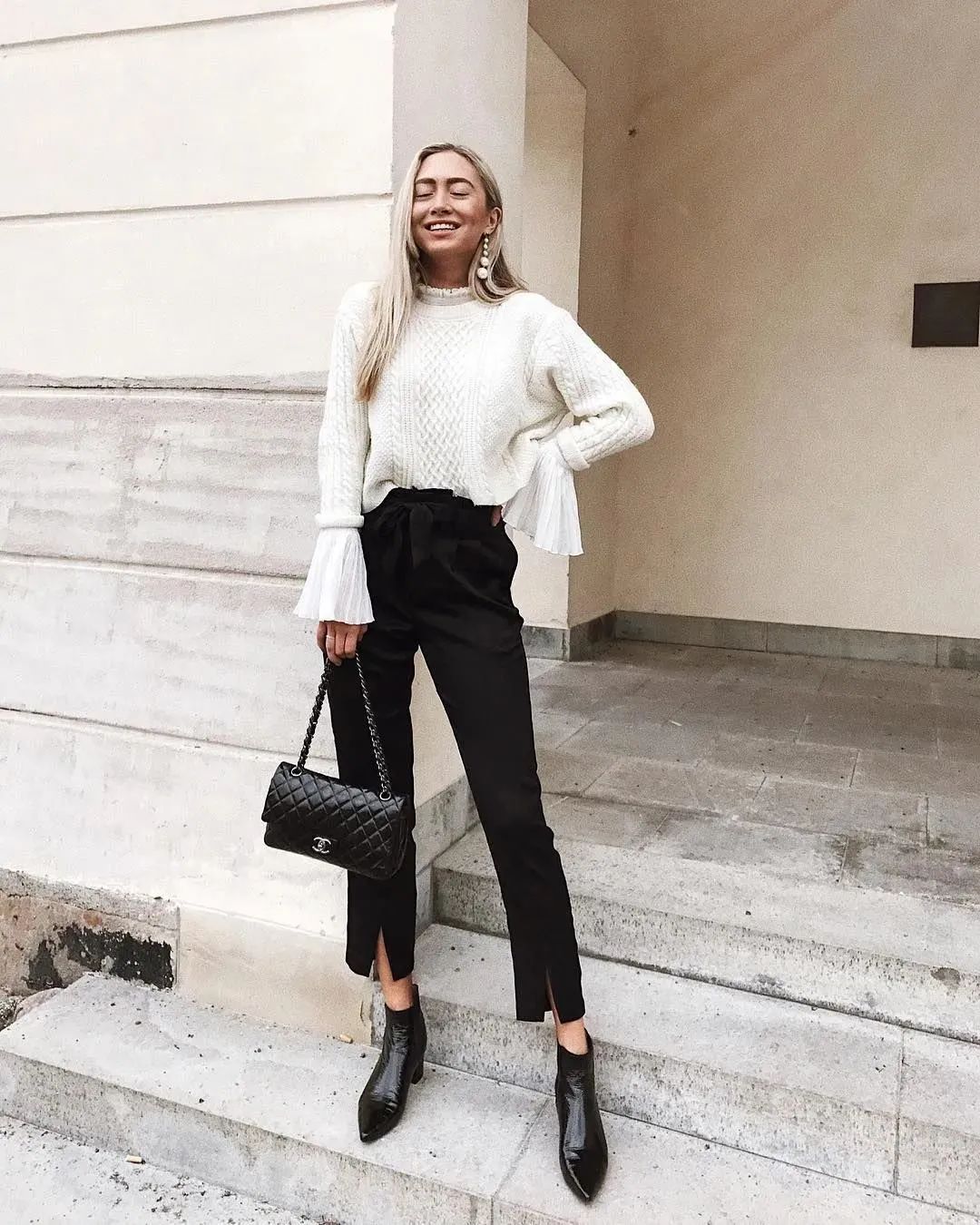 喇叭裤能勾勒出完美的腰、臀、胯曲线,最适合搭配短款内搭,比如毛衣或针织衫,温柔又复古。