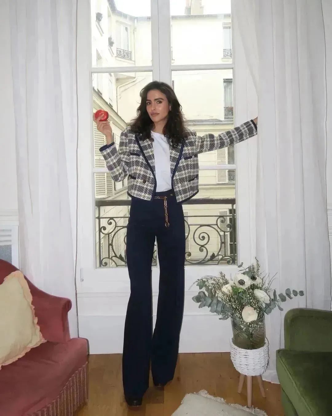 比起直筒赤裸裸的展示,喇叭裤的层次设计更能修饰腿型。