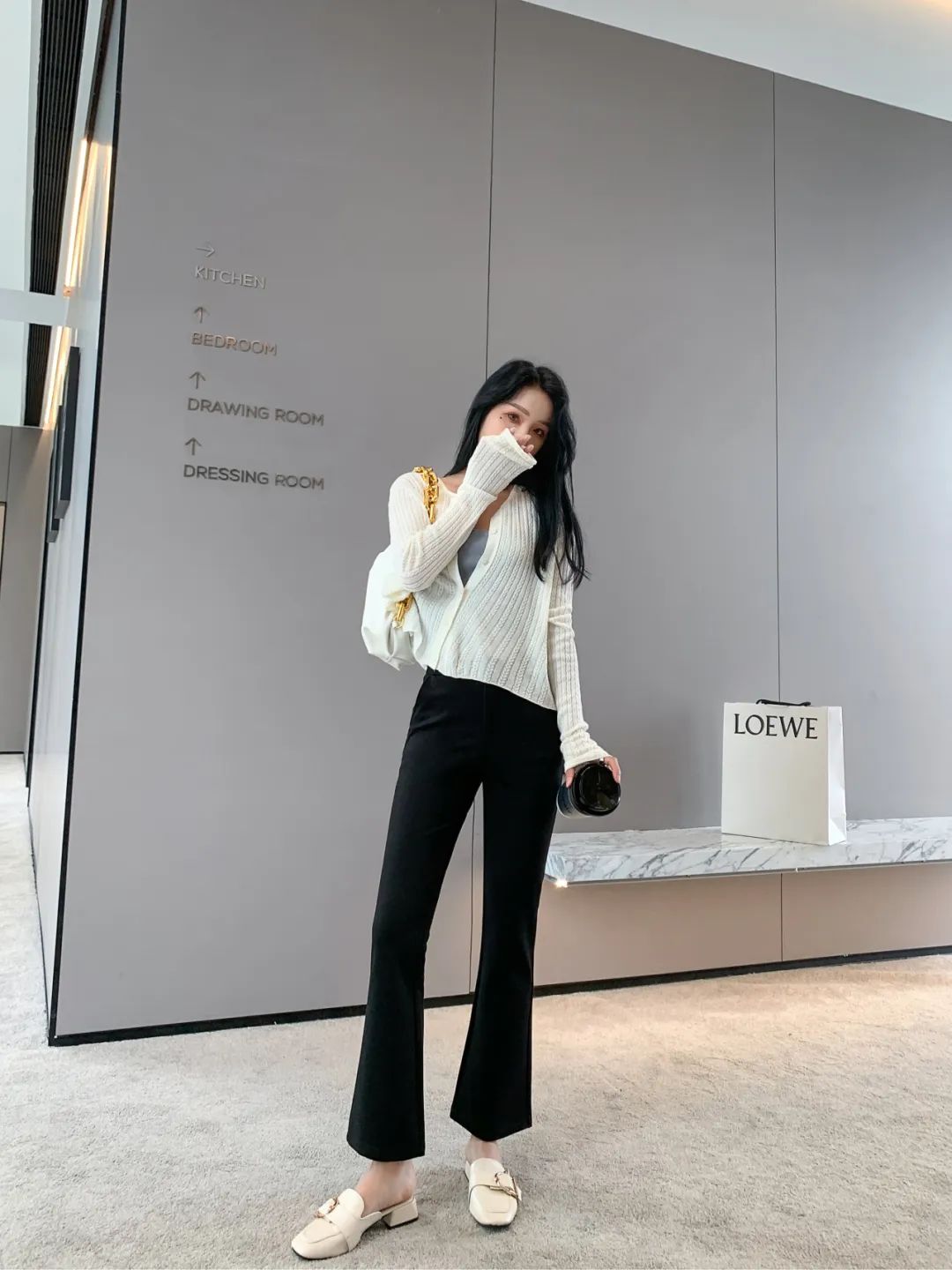 再加上喇叭裤膝盖微缩裤型设计,视觉上能将大腿和小腿的曲线修饰得更匀称、修长,营造出优雅而轻盈的身姿