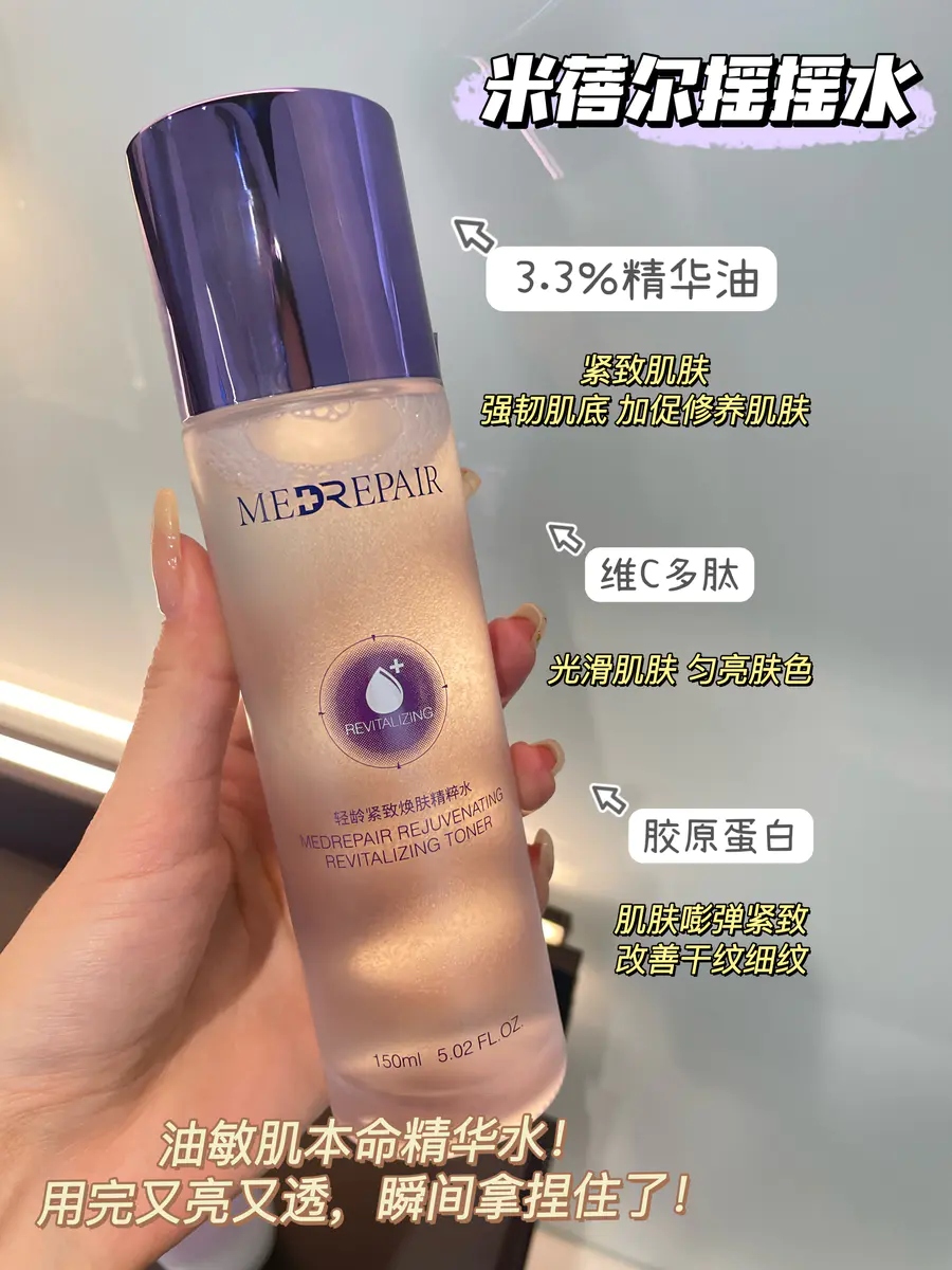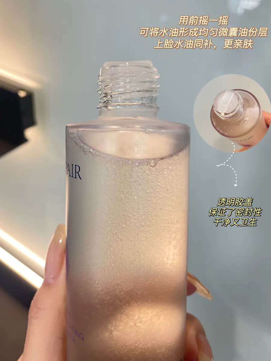 同时精华水采用水油双相的设计,这个设计在精华水的设计里真的很前卫。3.3%精华油相成分直接将焕亮能力拉满,也就是说为了让你的皮肤不仅亮一时,还能一直亮🌟。