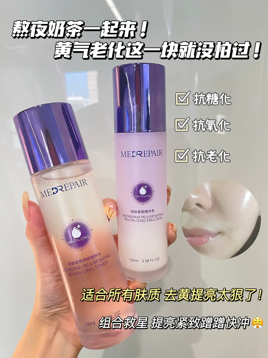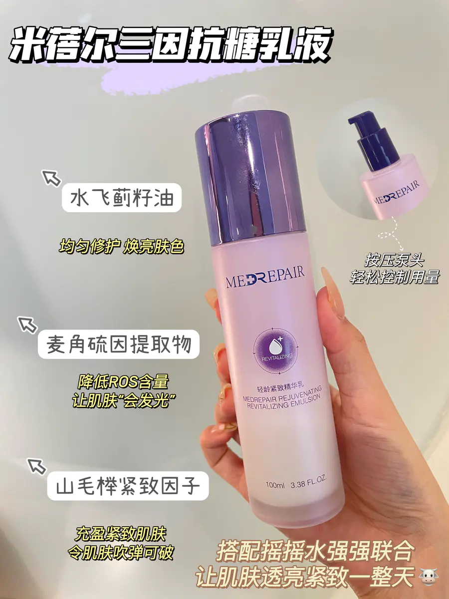 直到遇见这款摇摇水和三因抗糖乳液,这俩绝对是一对儿狠角色,对熬夜、糖化肌简直是精准狙击,🤗不得不说。去黄提亮的效率和效果真的🐮,感觉用完之后前后两天的肤色都差了一个色号,而且脸吹弹可破,好紧致啊。