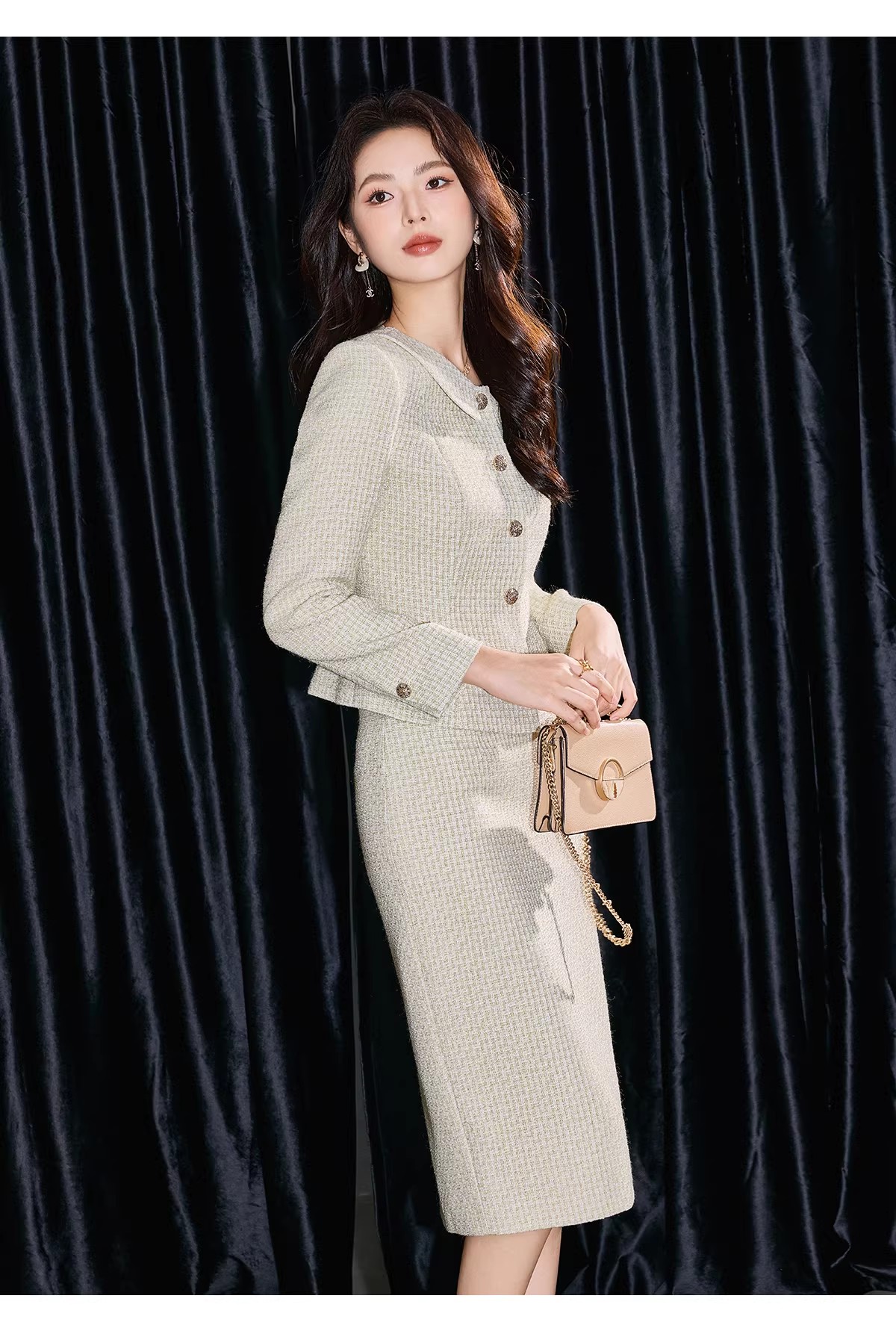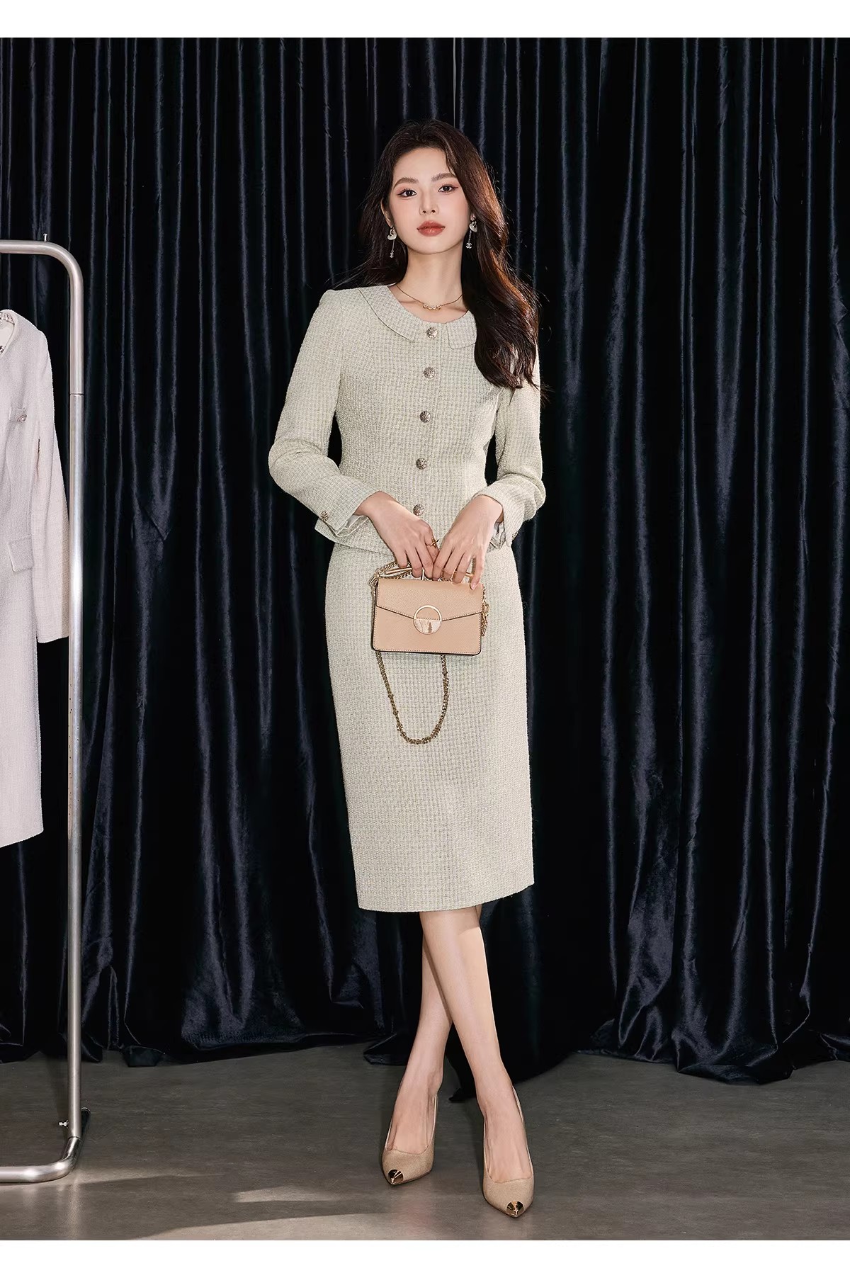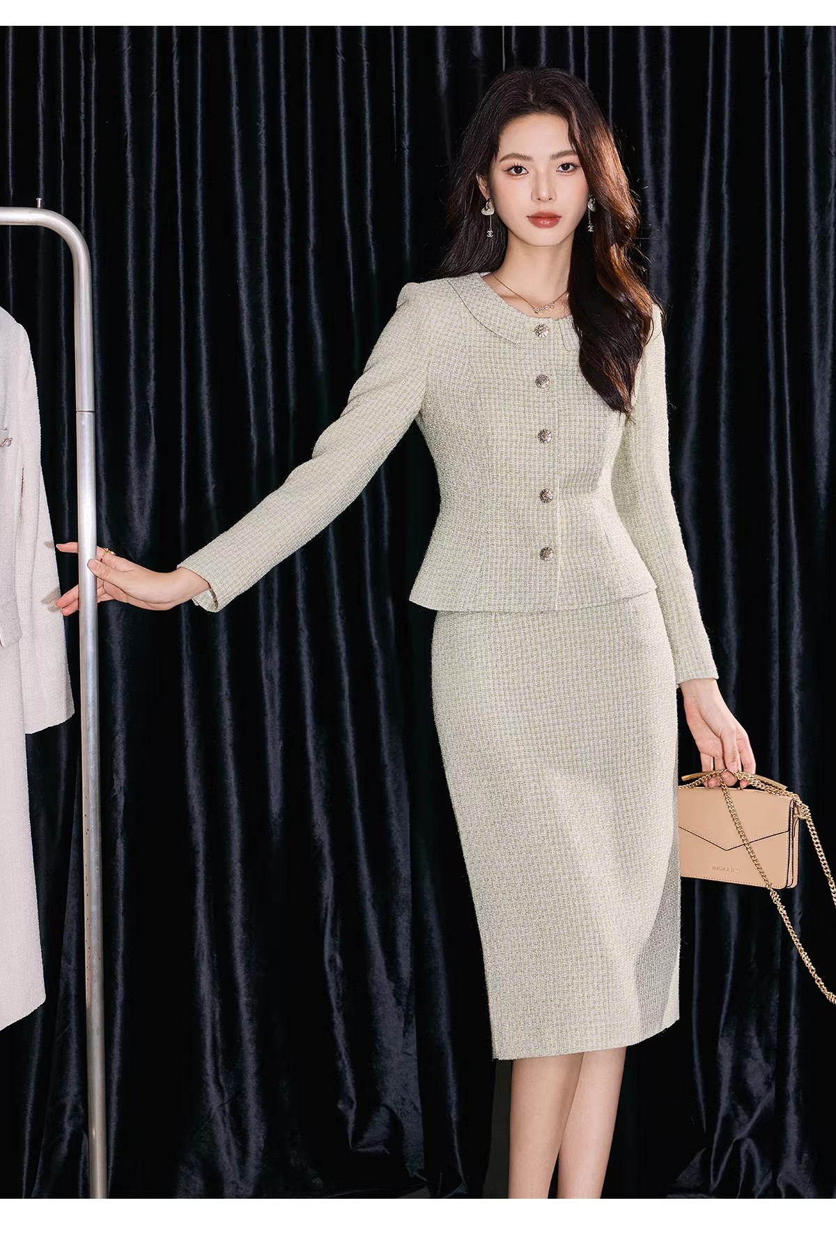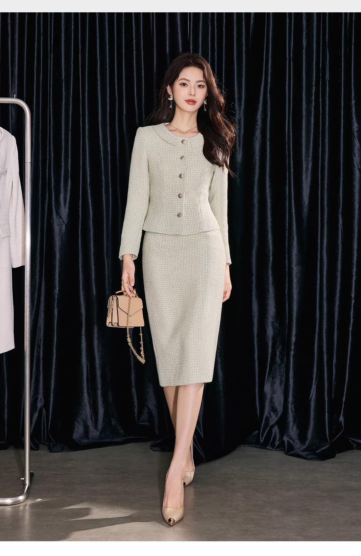 圆领外套剪裁利落,单穿内搭都出彩🧥。及膝半裙贴合身形,行走间尽显优雅步调,坐下时也保持端庄仪态。