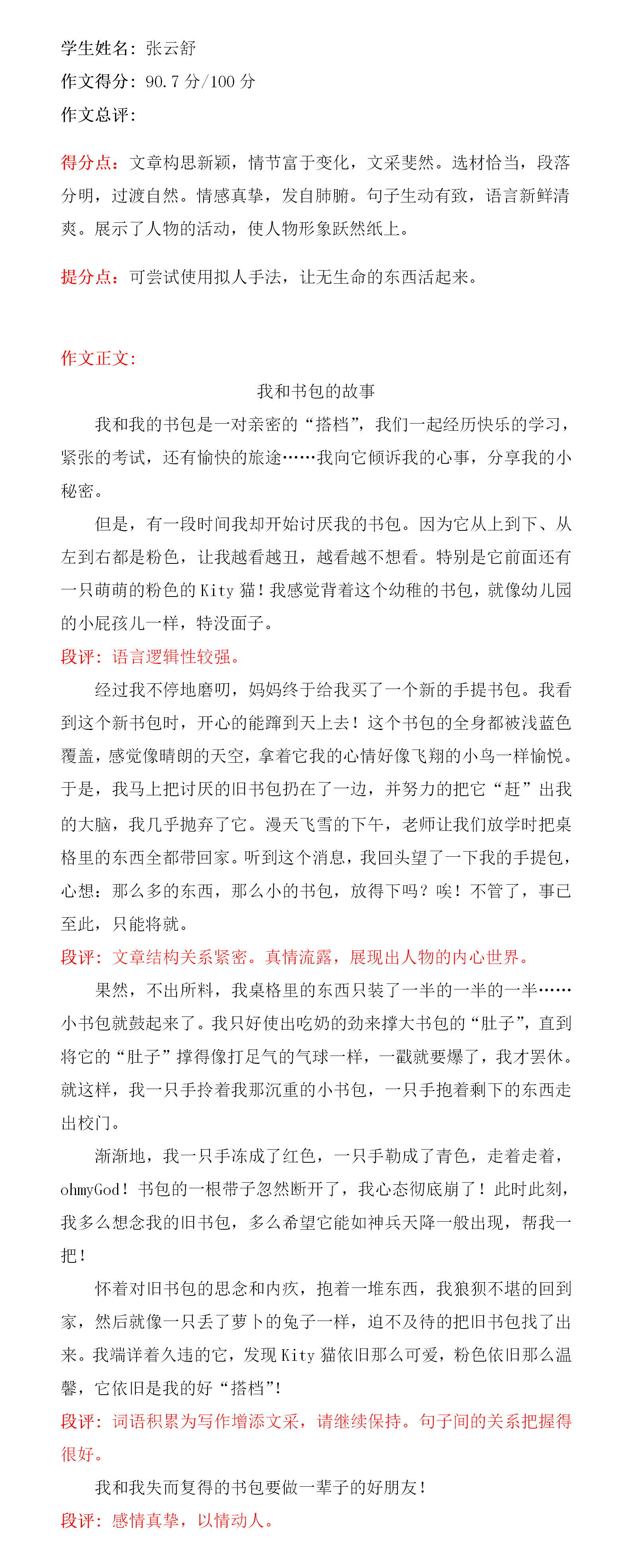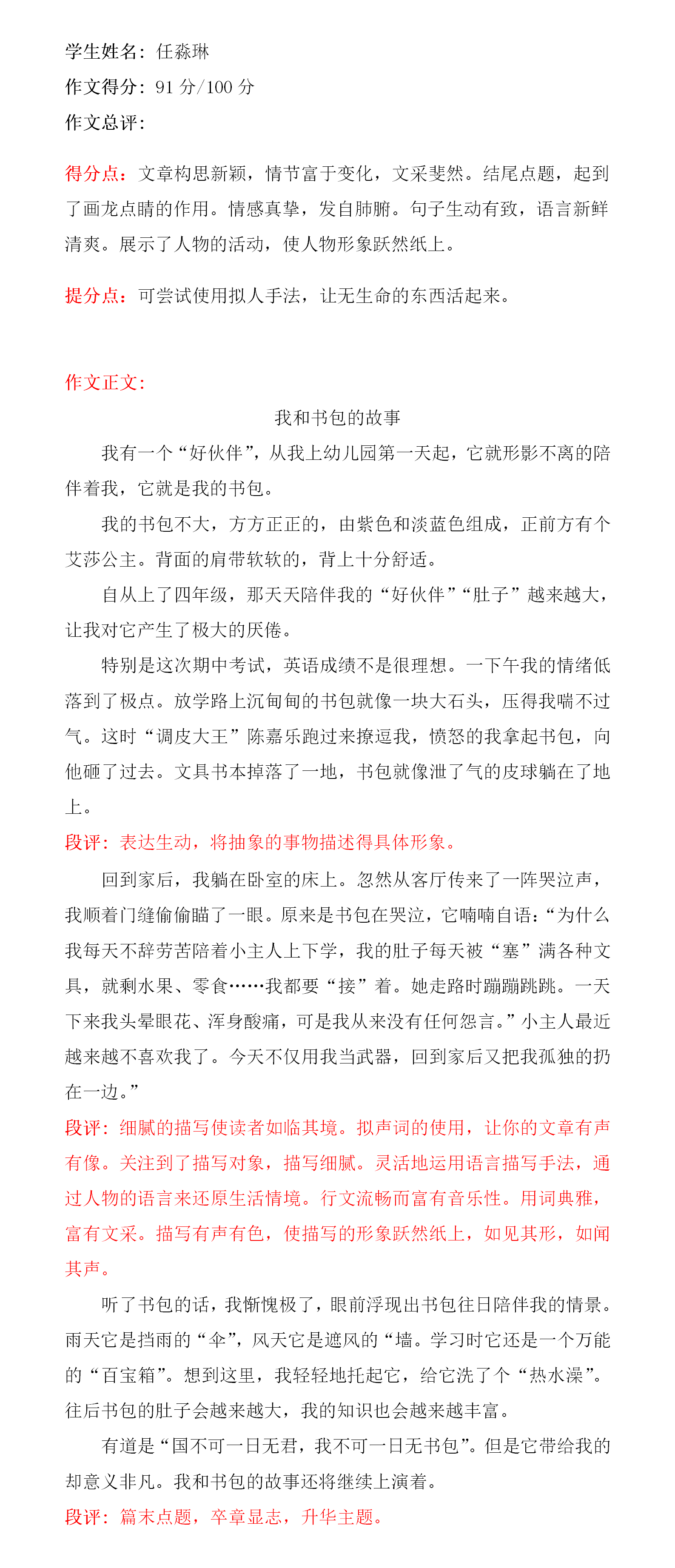 作文开头开门见山,介绍了我的“好伙伴”书包的外形以及带给我的感受。随后用拟人手法“肚子变大”介绍了我厌倦书包的原因。作文的高潮部分是作者运用想象的手法写了自己听到被扔出去的书包的自述,小作者赋予了书包生命,借助书包所述,凸显了本文的主题。随即用对比的手法写出了自己对书包态度的改变。作文的结尾更是加入了名言的改编,充满趣味,而结尾“我和书包的故事将继续上演着……”中省略号更是将人代入无限遐想中。