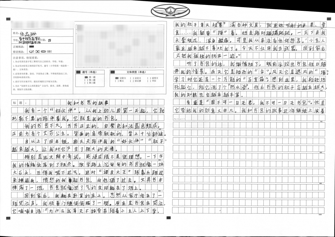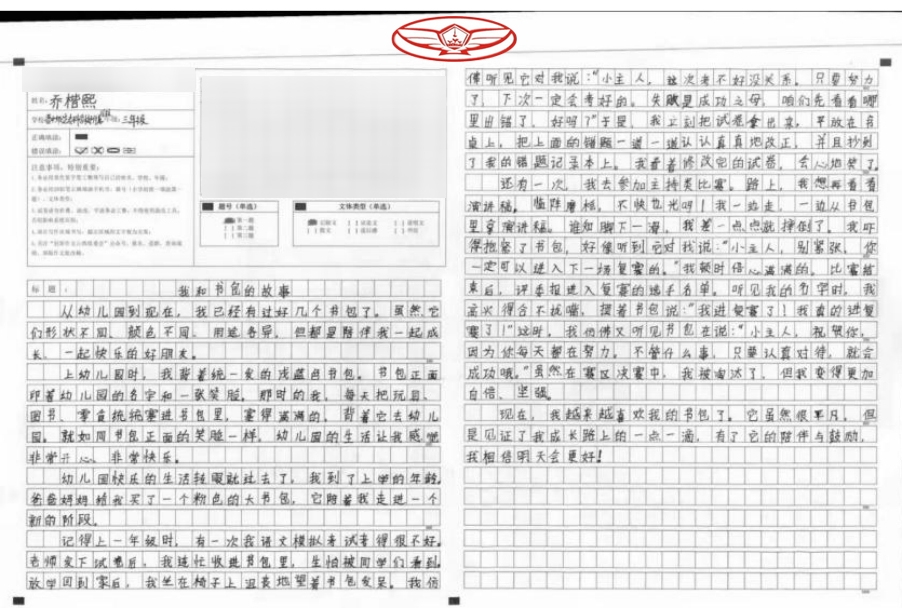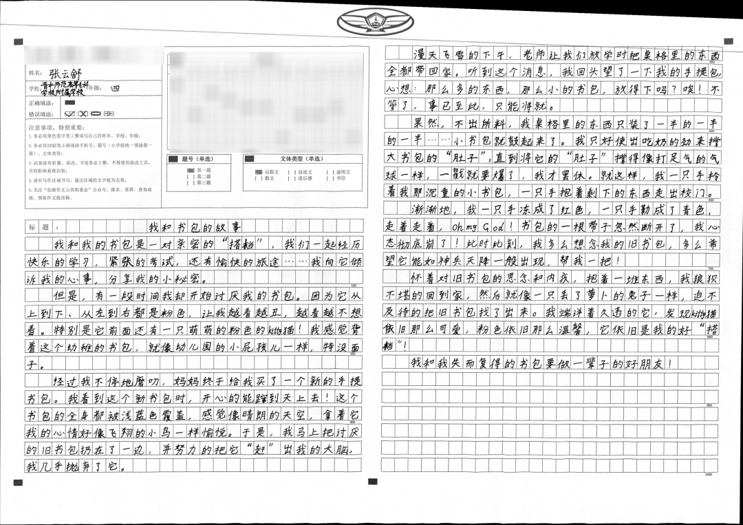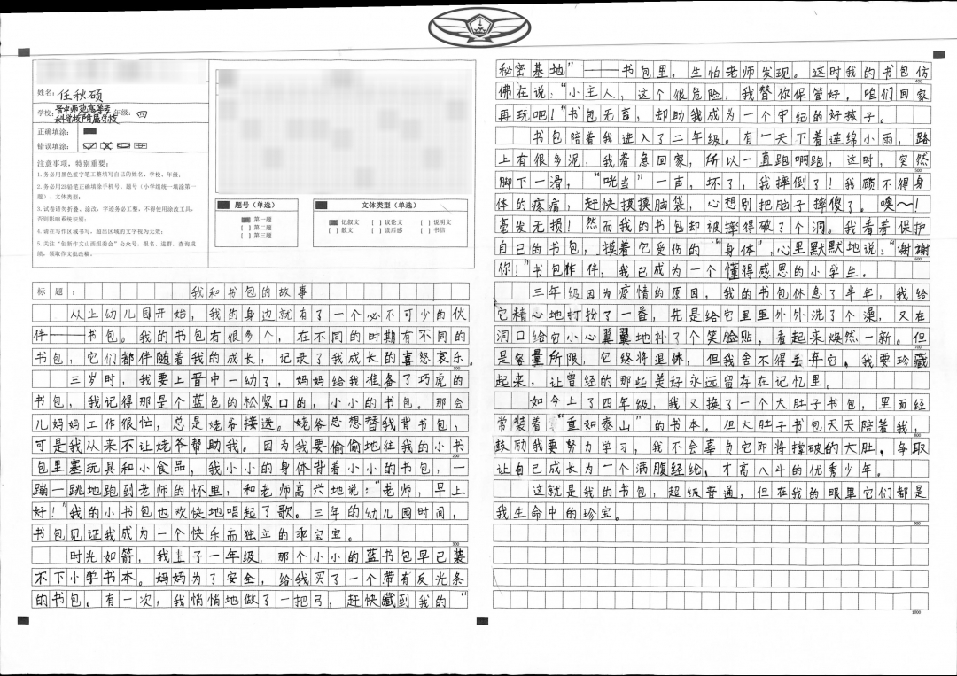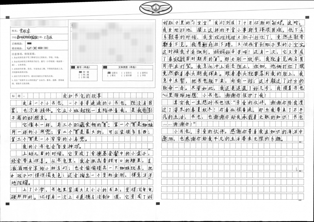 我拿到这个写作题目时,构思了很久,也尝试写了两次童话版的《我和书包的故事》,但完成之后都不满意。我试着不要那么天马行空,就静下心来写写我和书包发生的真实故事。