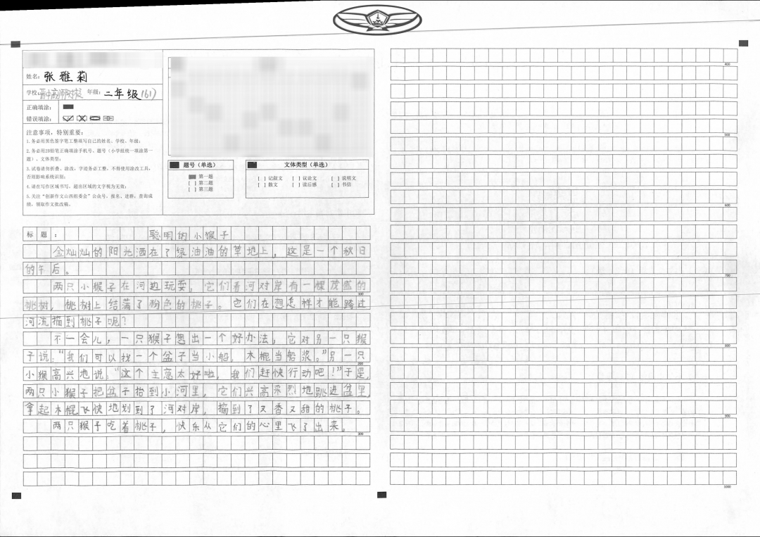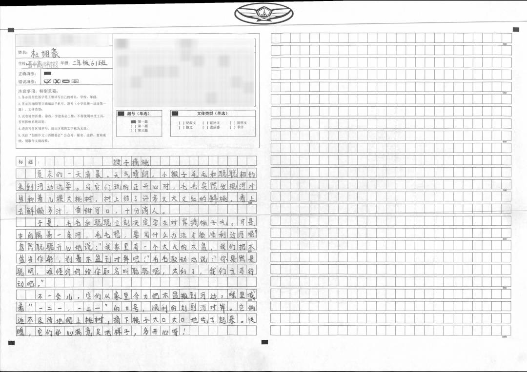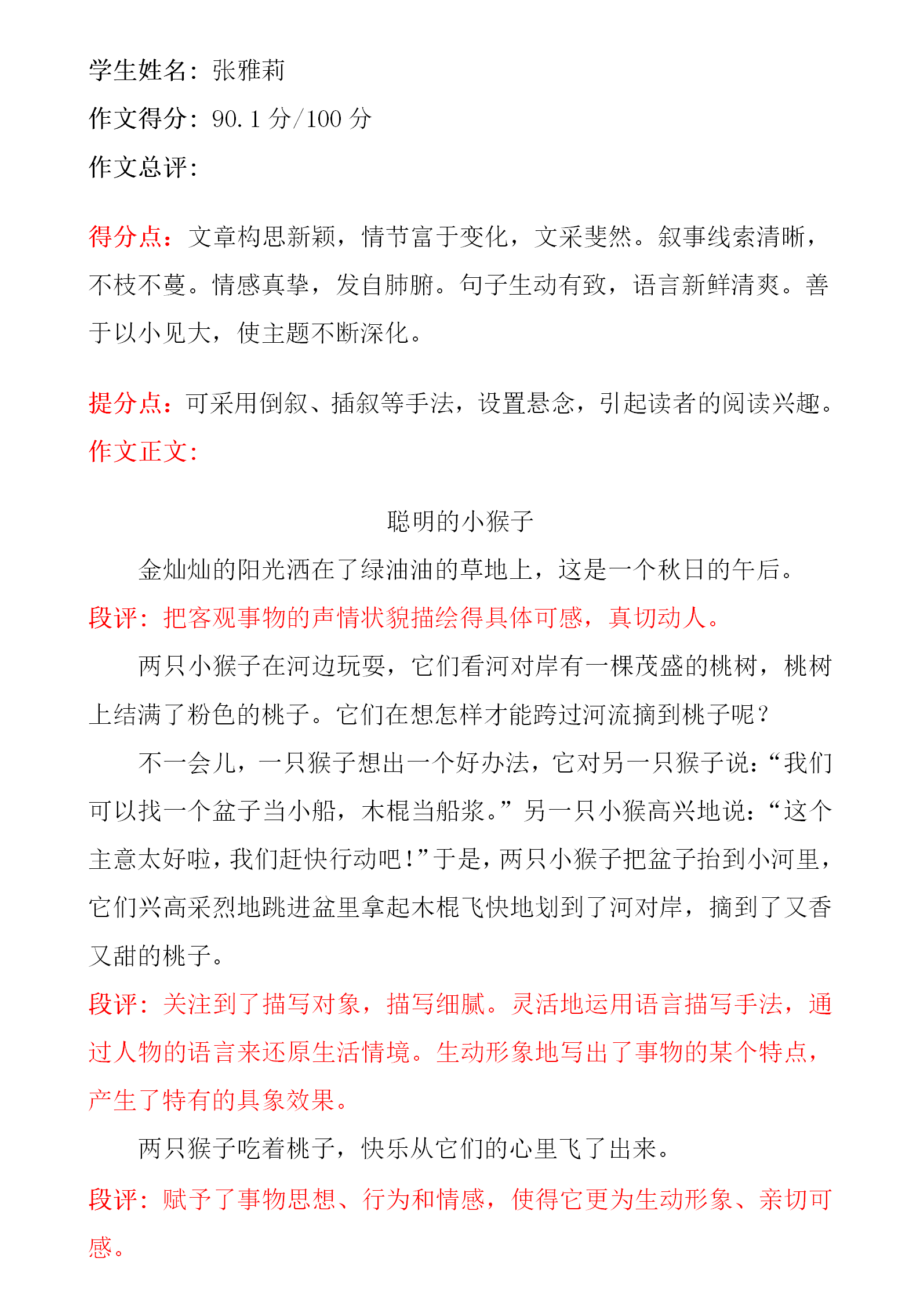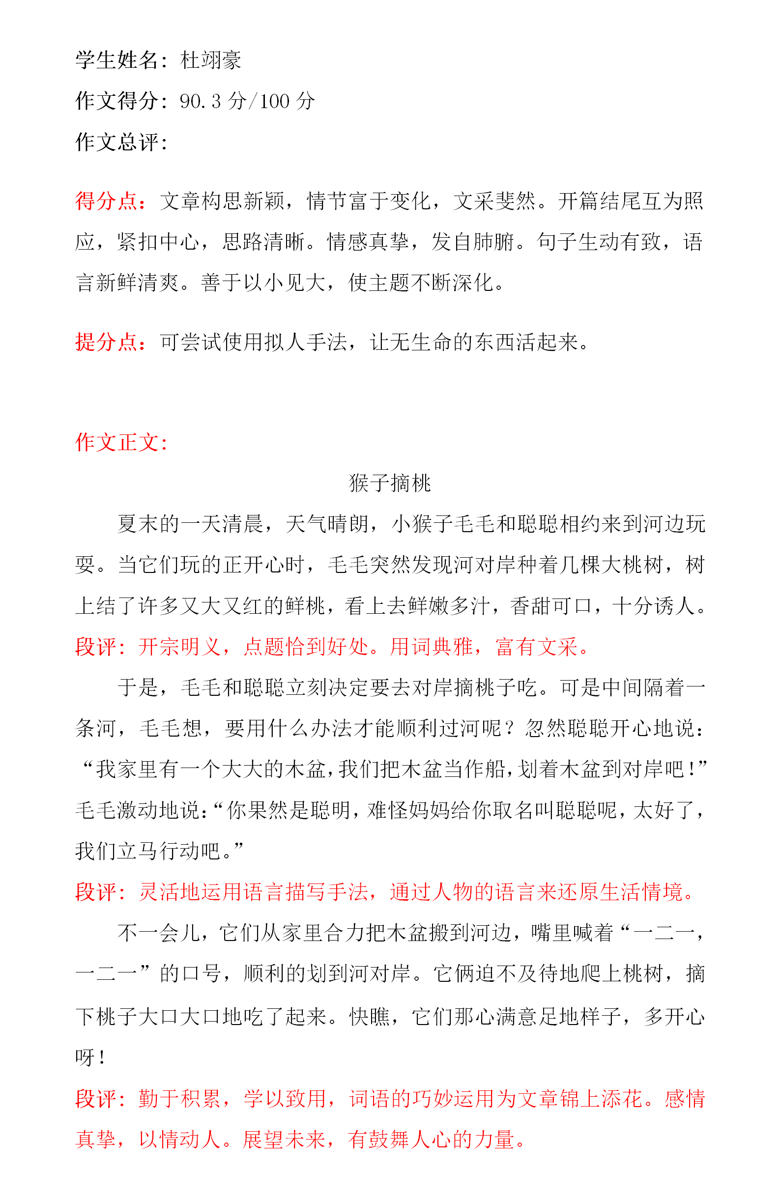 看到题目中的这幅图,首先认真观察,我看到地点在小河边,人物是两只猴子,他们想摘河对岸的桃子吃,根据画面我想象应该是一个秋日的午后,很快我想好了故事情节,并且,注意把平时积累的好词好句都用上。这样,完成了这篇《聪明的猴子》。