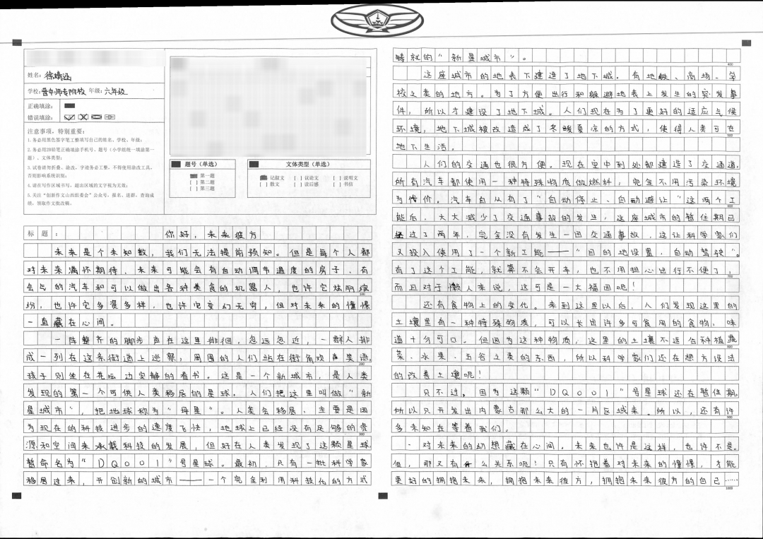 当我看到题目“你好,未来––”我的脑海里就不禁蹦出许许多多的幻想。我对于未来的世界充满了憧憬,只要自由的幻想,未来的蓝图便一点一点的浮现在我的脑海。我认为,想象源于生活。不管是家庭小事,还是国家大事,只要在生活中细细观察,便都可以作为我们对未来幻想的根基,从而驱使着我们绘制出拥有无限可能的未来蓝图。