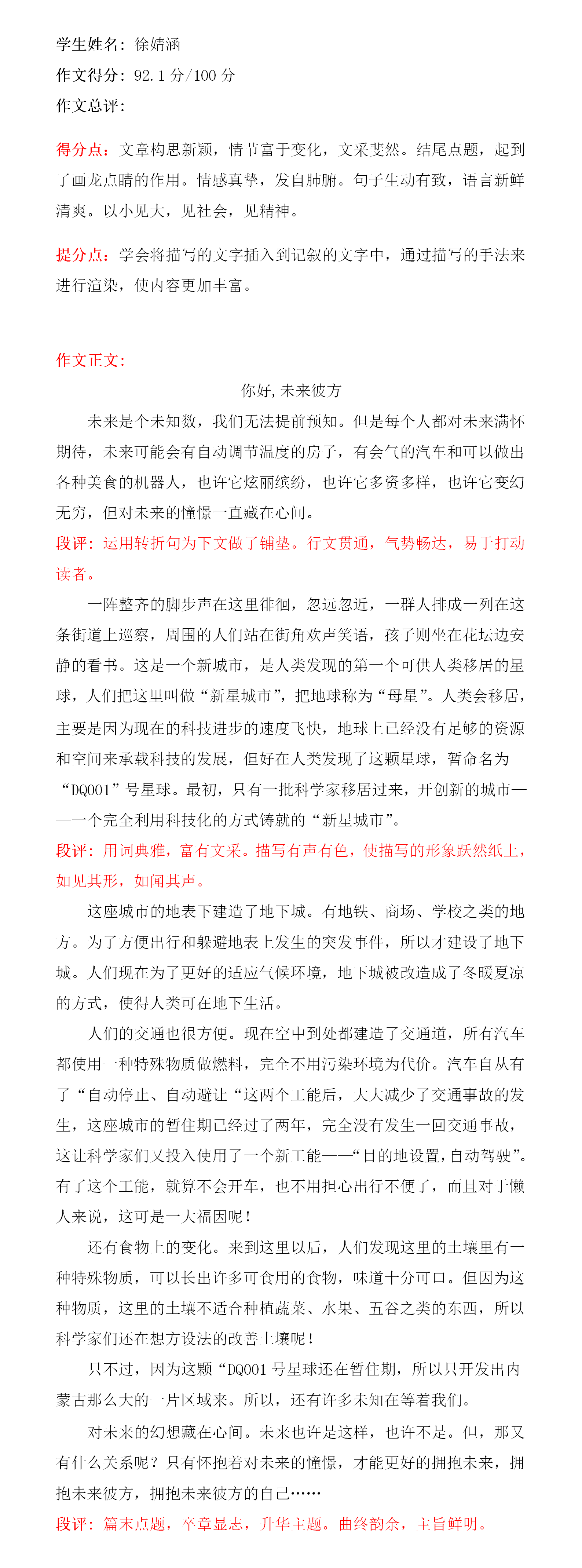 文章凭着丰富的想象,凭着多彩的语言,将“未来之城”呈现在读者面前。作品的构思是巧妙的,文笔也是简洁流畅。想象大胆,富有创造力,文章读起来新颖奇特极具吸引力。一篇短小的文章,就像一叶载满梦幻的小舟,驶向天马行空的彼岸,加油,少年!