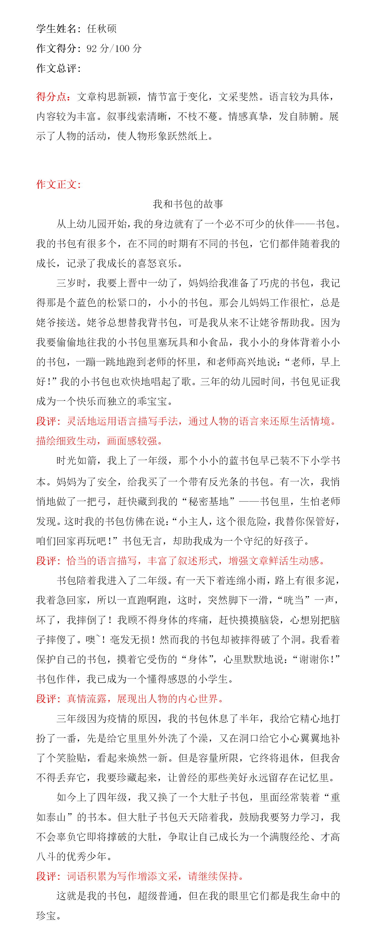 秋硕同学的习作讲述了不同年龄阶段自己和书包之间发生的故事,娓娓道来,真实而亲切,有童真,有童趣。更为可贵的是,他是一个懂得感恩的孩子,把自身的不断成长,不断进步通通归功于书包。其实,这些都是他严于律己的结果,书包只是见证者。恰恰是这一点,赋予了书包以思想,以灵性;赋予了文章以真情,以魅力。