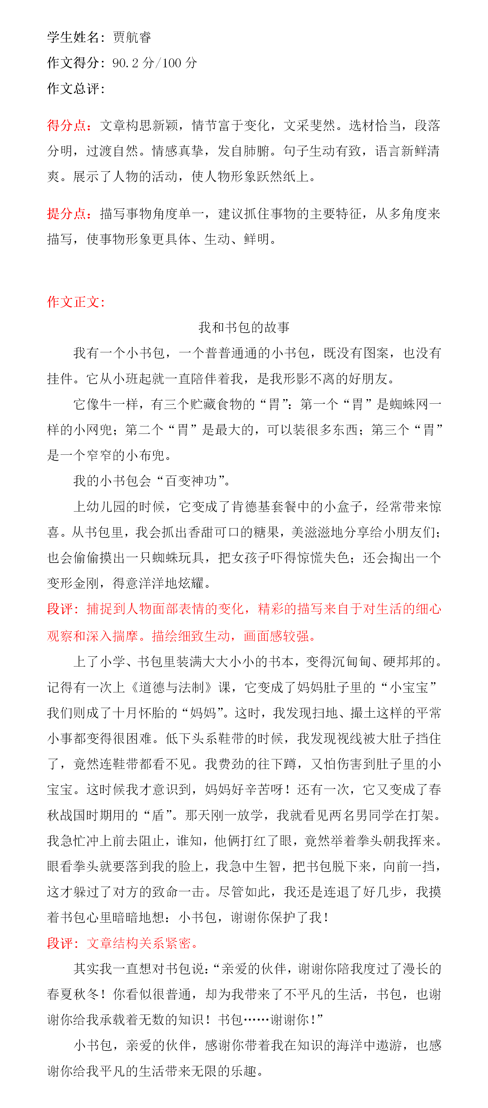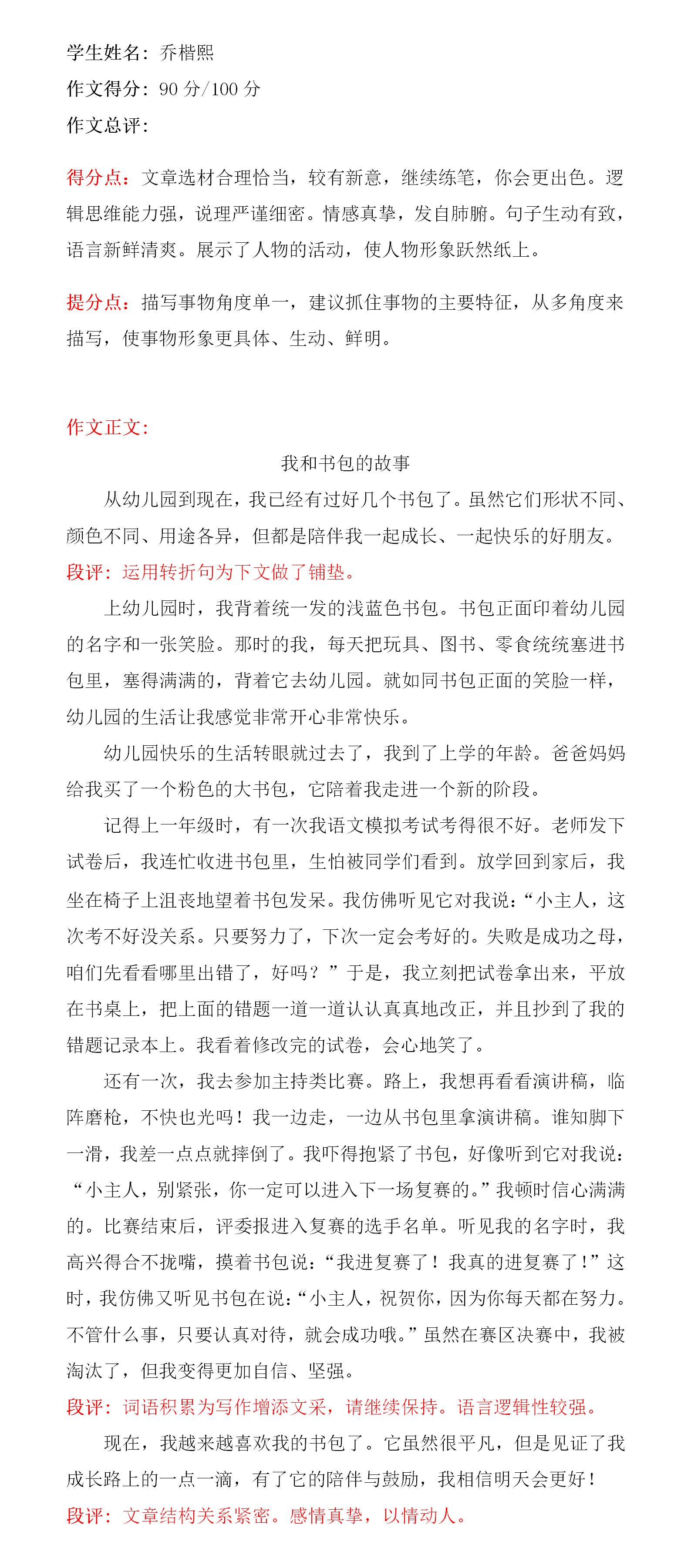 孩子能在写作中抒发自己对书包的情感,说明孩子在生活中善于发现、善于思考。自老师倡导孩子多读书以来,孩子逐渐养成了读书的习惯。今后我们将继续鼓励、陪伴孩子快乐阅读,和孩子一起在阅读中享受乐趣。