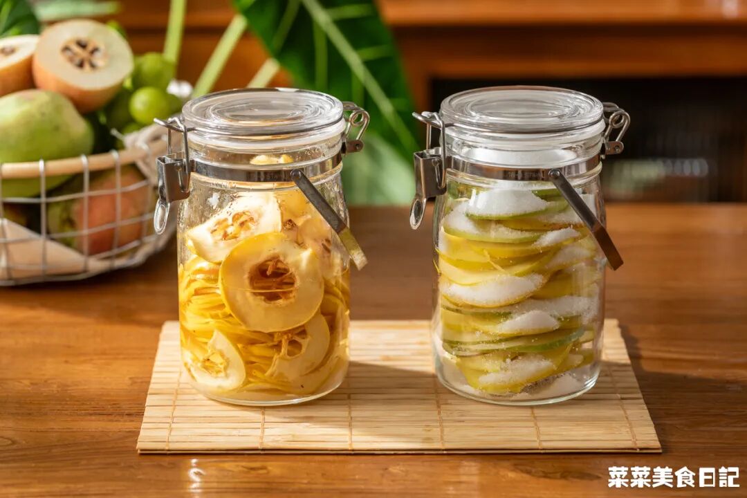 4.酸木瓜和细砂糖按1:0.6或1:0.7或1:1比例,一层酸木瓜片,一层细砂糖装入消毒过无水无油的玻璃瓶,室温放置3-5天,待糖完全融化即可饮用